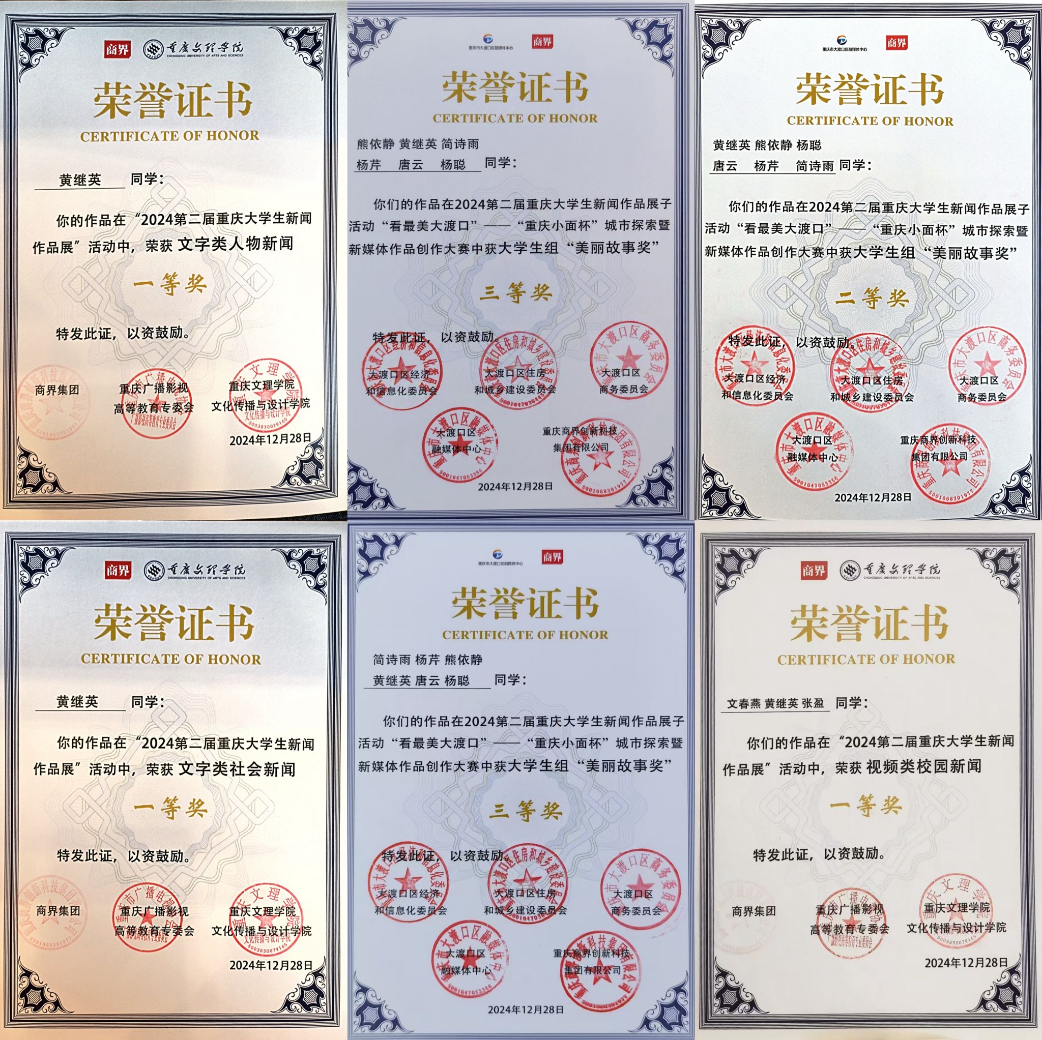 值得一提的是,本次活动除了评选第二届重庆大学生新闻展获奖作品外,还现场为由大渡口区融媒体中心主办的“看最美大渡口”——“重庆小面杯”城市探索暨新媒体作品创作大赛颁发了奖状。在郝树静老师的指导下,綦江校区新采学员简诗雨、熊依静、黄继英、杨芹、杨聪、唐云6名同学创作的3篇文字类作品《见证时光——钢花影剧院的六十六载》《雨过古镇,江声依旧》《走进大渡口,感受“慢生活”》,荣获大学生组一项二等奖及两项三等奖。