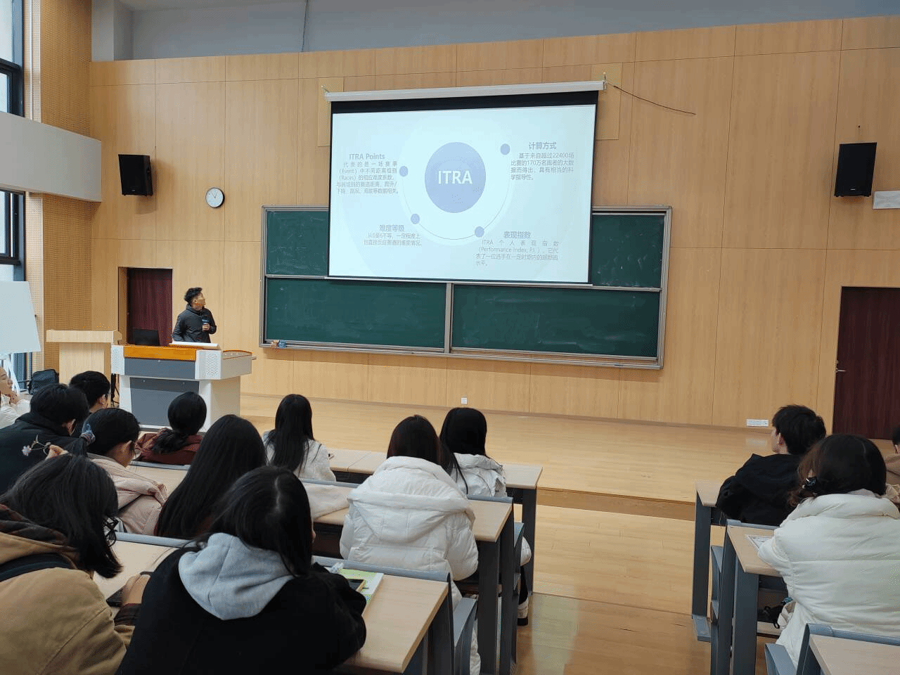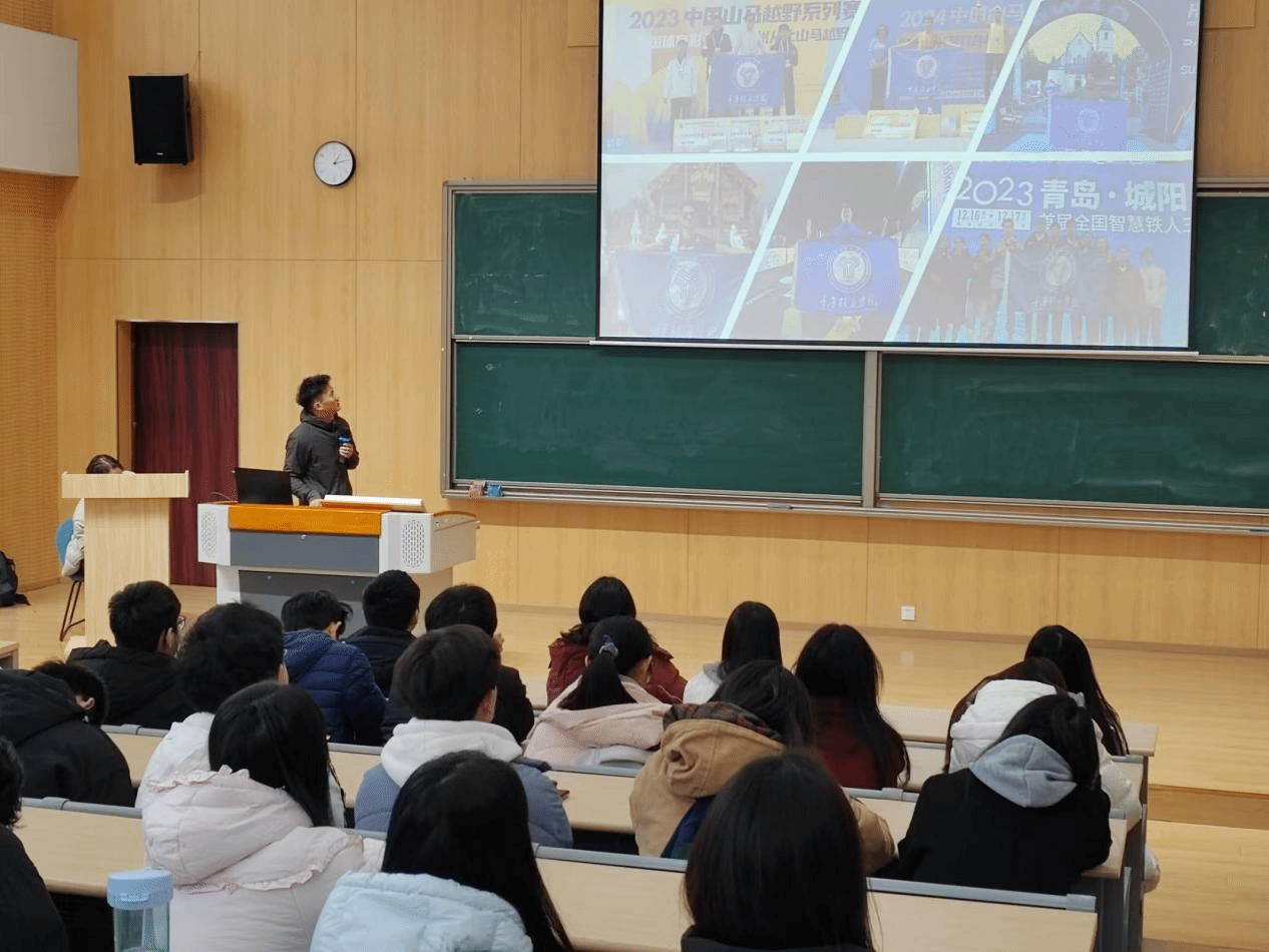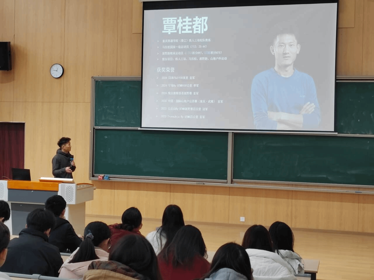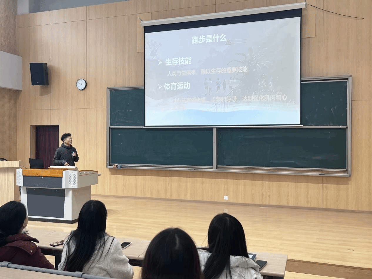 讲座特别邀请了校铁人三项教练覃桂都老师担任主讲嘉宾。覃老师不仅拥有丰富的跑步实战经验,还具备扎实的体育专业知识及多年教学经历,在马拉松、越野赛等领域颇有建树。作为一名多次获得国际赛事荣誉的专业选手,覃桂都教练的成就堪称辉煌。2023年,覃教练在多个赛事中表现突出,先后获得自在普陀越野赛男子组冠军、重庆红池坝云端山地跑男子20K组第二名、云丘山越野赛DMY100公里组男子冠军等多个奖项。最令人印象深刻的是,他在2023年和2024年获得了多个赛事的冠军与亚军,包括中国山马越野系列赛和重庆老瀛山越野挑战赛等重要赛事。这些成绩不仅证明了覃教练的顶级实力,也让在场的跑者们深受启发,进一步加深了对科学训练和不断突破自我的认识。