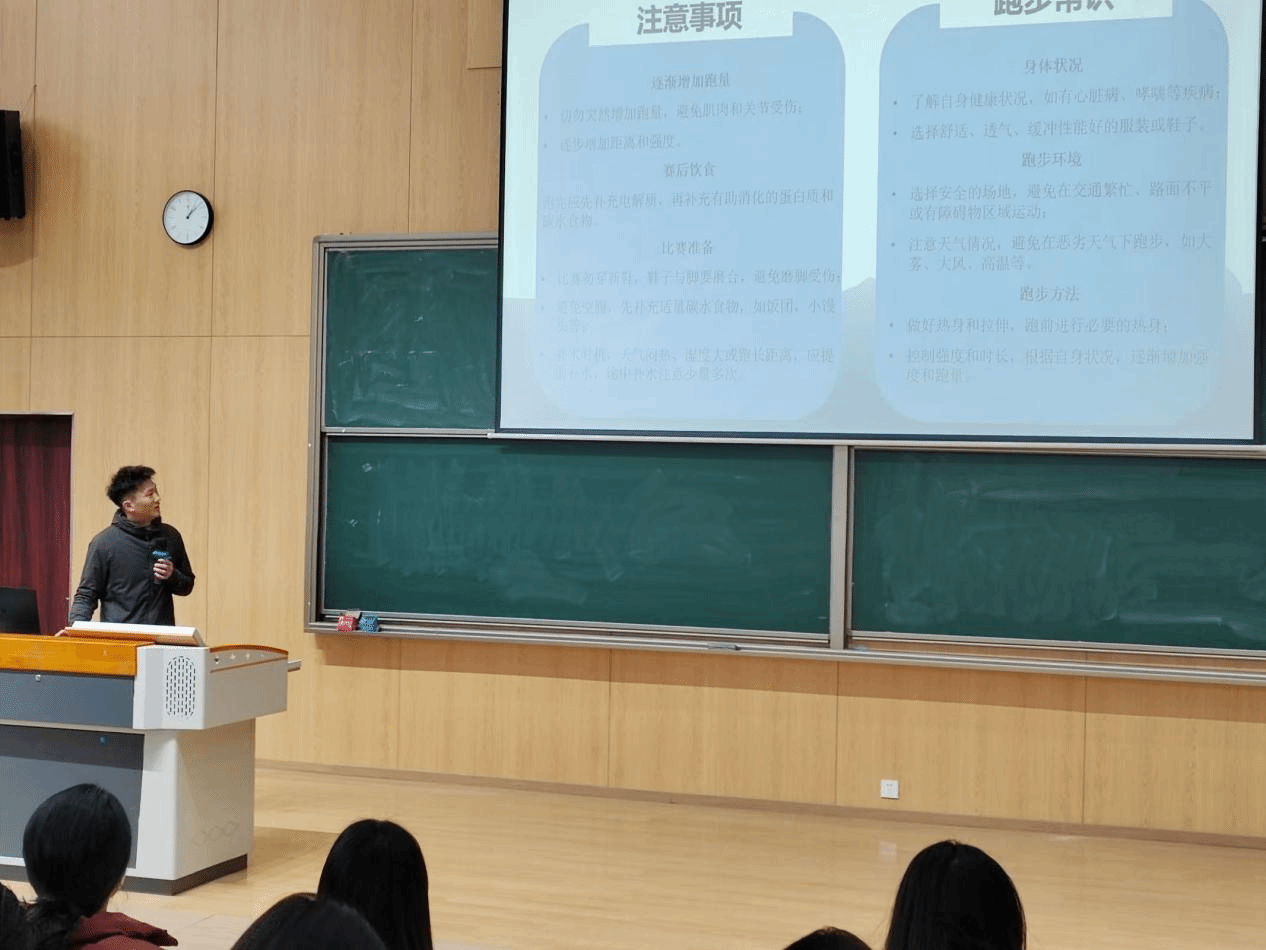 而在谈及“跑步要注意的问题”时,覃老师更是结合实际案例,为同学们送上了满满的干货。他强调,充分的热身运动是跑步前必不可少的环节,能够有效降低运动损伤的风险。跑步过程中,正确的姿势与合理的呼吸节奏至关重要,错误的姿势可能导致关节受力不均,引发伤痛,而合理的呼吸则能保证运动中的氧气供应,提升跑步的效率。此外,选择合适的运动装备、制定个性化的训练计划以及注重运动后的拉伸恢复,都是科学跑步的关键要素。