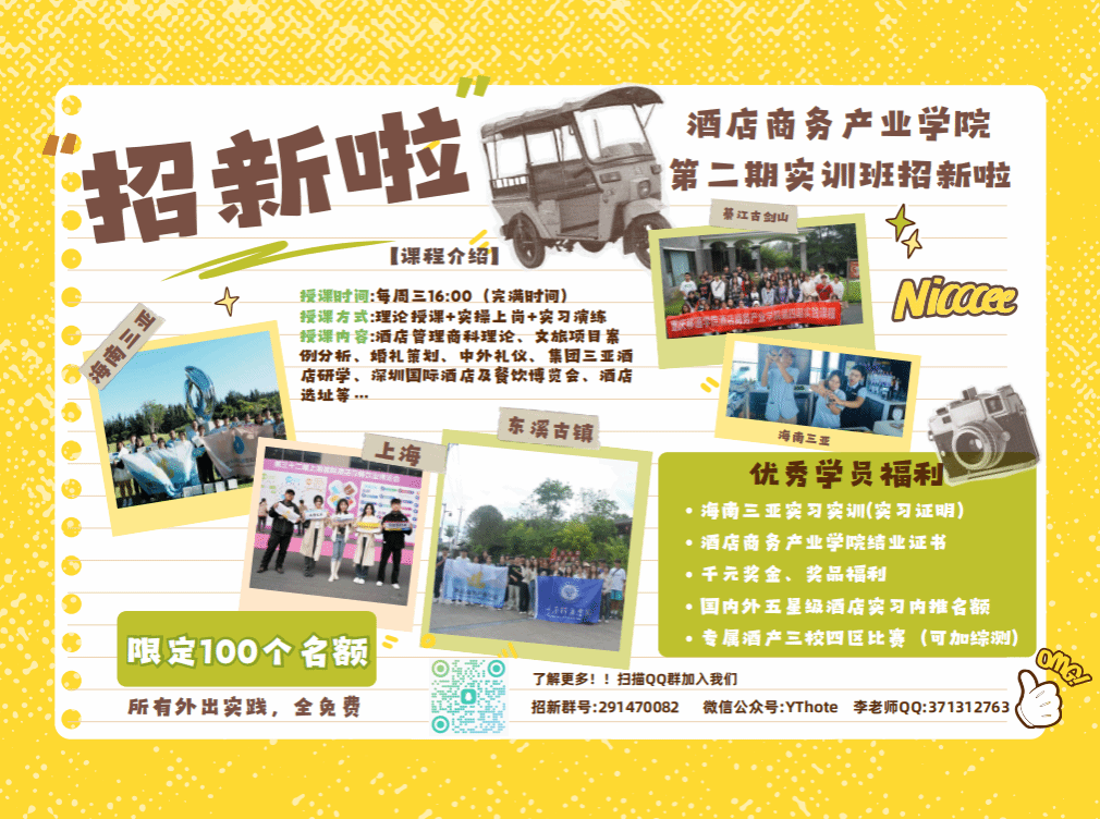 实习演练内容为国内外星级酒店、特色民宿、集团三亚酒店免费提供实习机会。日常授课时间为2024-2025学年第一学期每周三下午16:00(完满活动时间)。
