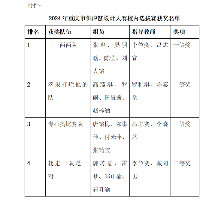 附件:2024年重庆市供应链设计大赛校内选拔赛获奖名单