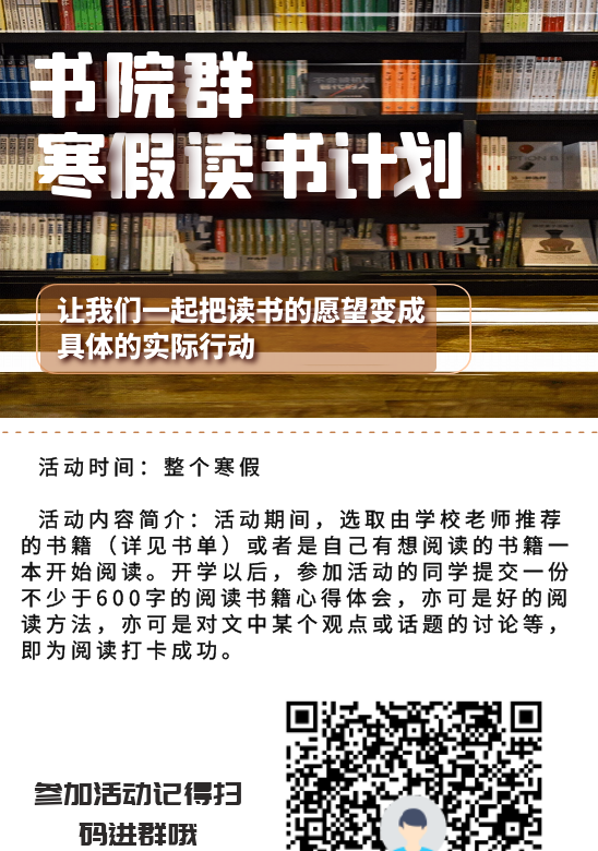 古人有云:“春诵、夏弦、秋学礼、冬读书。”为丰富书院学子假期的文化生活,以读书增智慧、以读书育人格,同时让同学们在阅读中收获知识,不断培养自身的商科思维,2021年寒假期间,行者公园书院群、智能工程学院联合开展了以“细嗅书牍,经世致用”为主题的寒假读书计划活动。