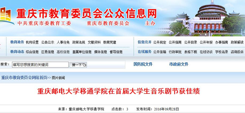 9月25日,首届大学生音乐剧节(北赛区)颁奖仪式在北京举行,重庆邮电大学移通学院原创音乐剧《错轨》、《青春的呼唤》分别荣获第二名和第三名,是我市参加该项比赛的唯一获奖高校。