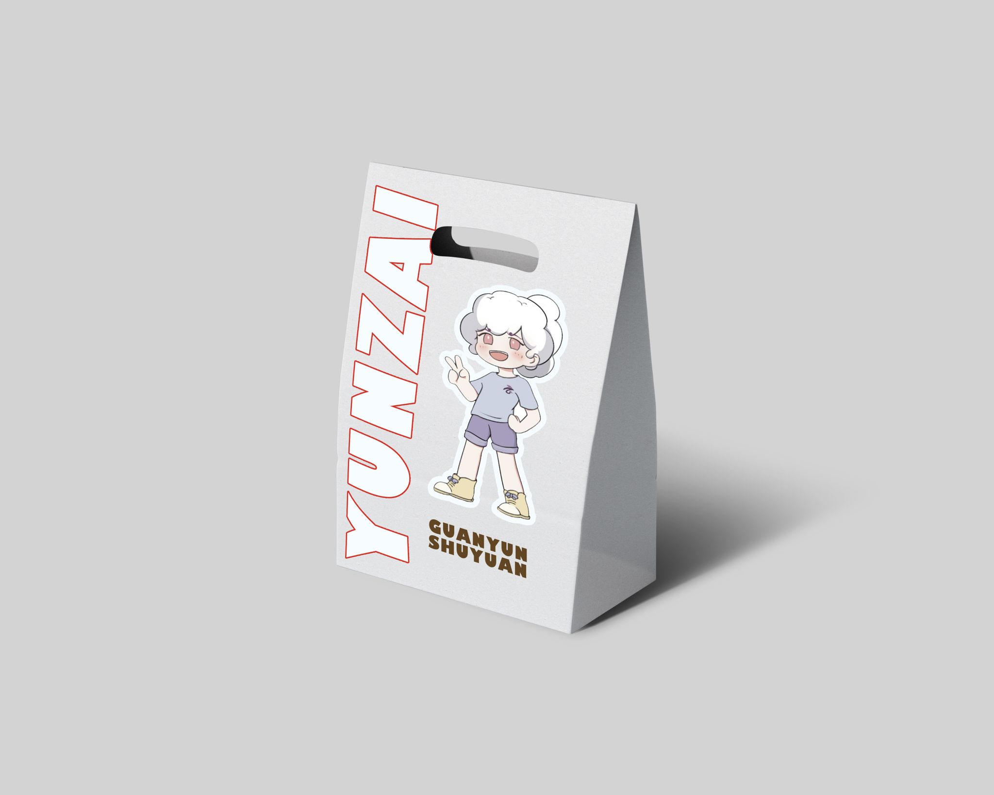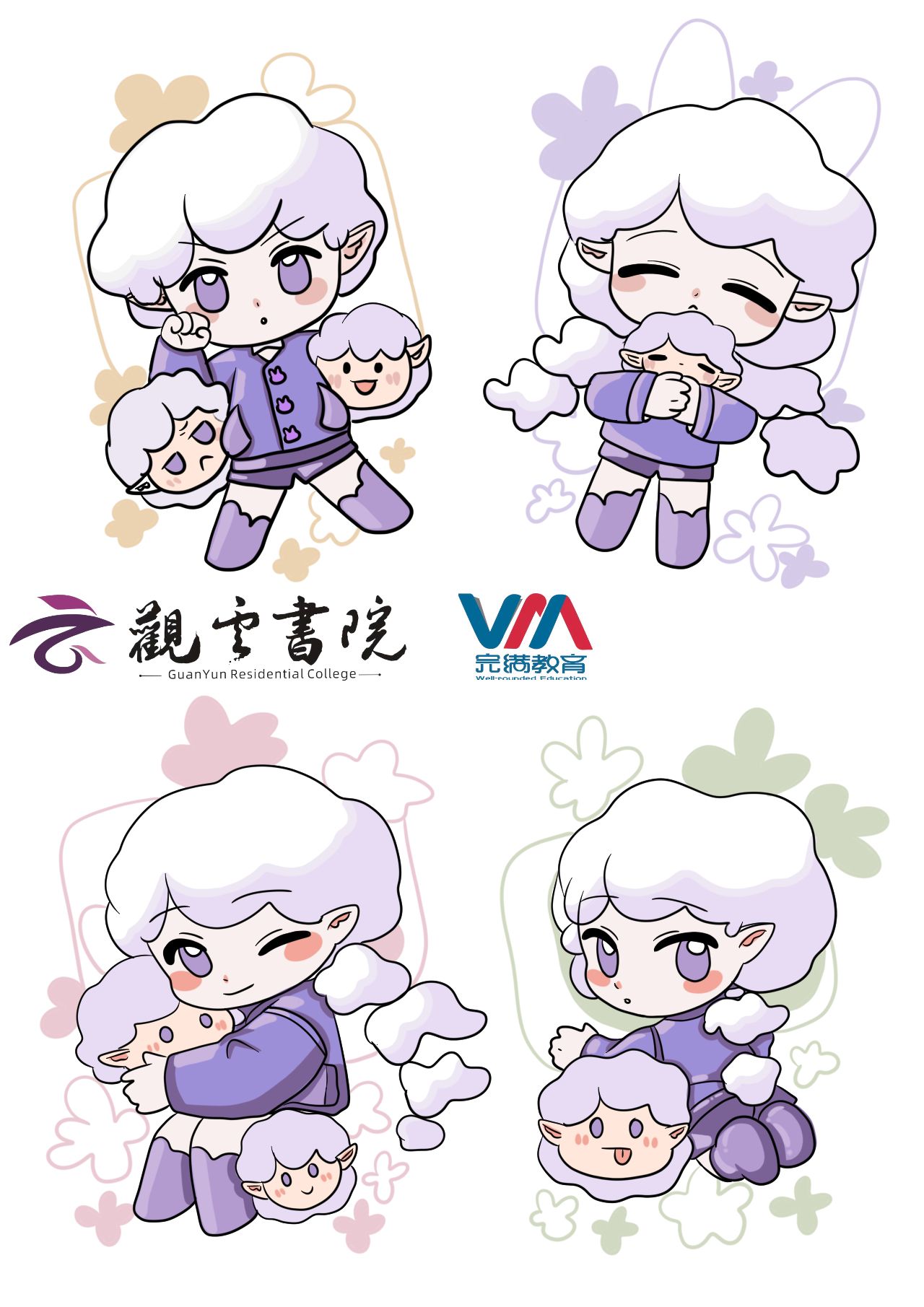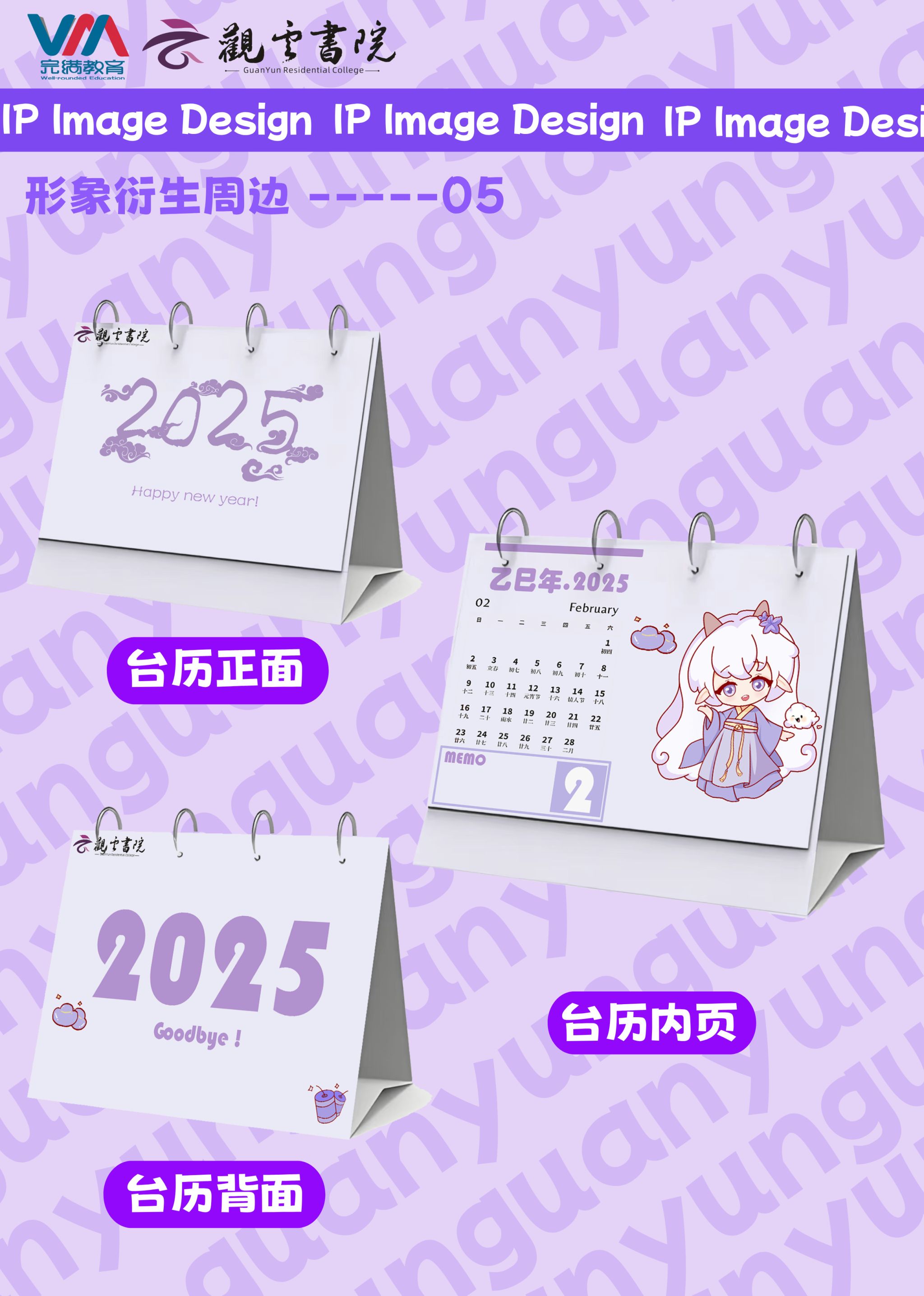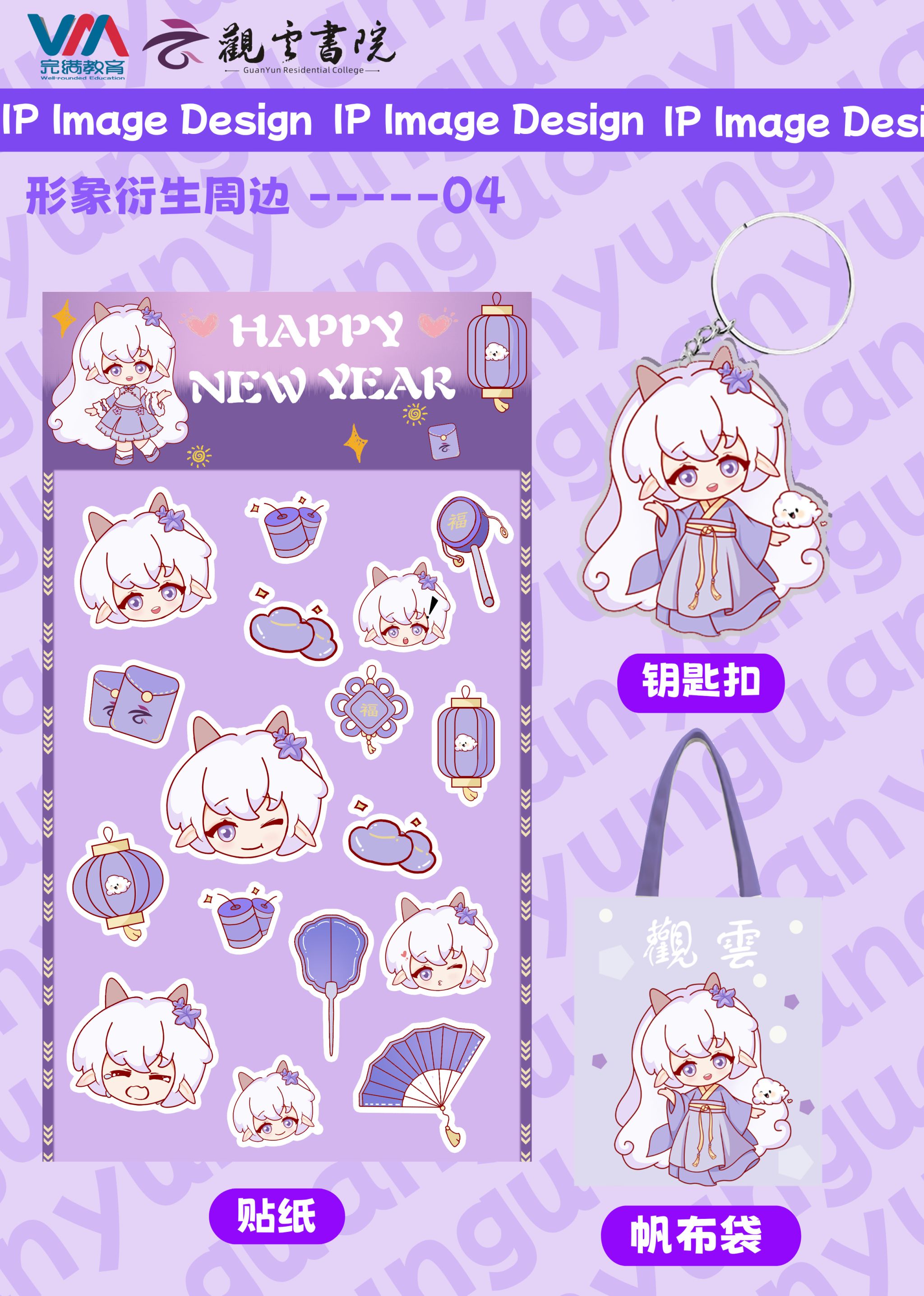 表情包:社交场景中,以“云仔”作为原型,设计多款表情包;钥匙扣:日用场景推出系列主题周边——金属钥匙扣采用立体冲压技术,以完整IP造型呈现;帆布包:以远山黛渐变色为底,运用烫银工艺将IP置于层云蒸腾的视觉中心,侧边暗藏可替换节气诗词飘带;日历:日历延续书院VI体系的桔梗紫色调,日期页植入IP四季换装插画,背面增设节气物候知识窗格;手提袋:以极简主义重构文化表达,纯白基底搭配浮雕烫金IP剪影,局部点缀书法体"观云"篆章,在时尚审美中完成书院精神的可视化转译。