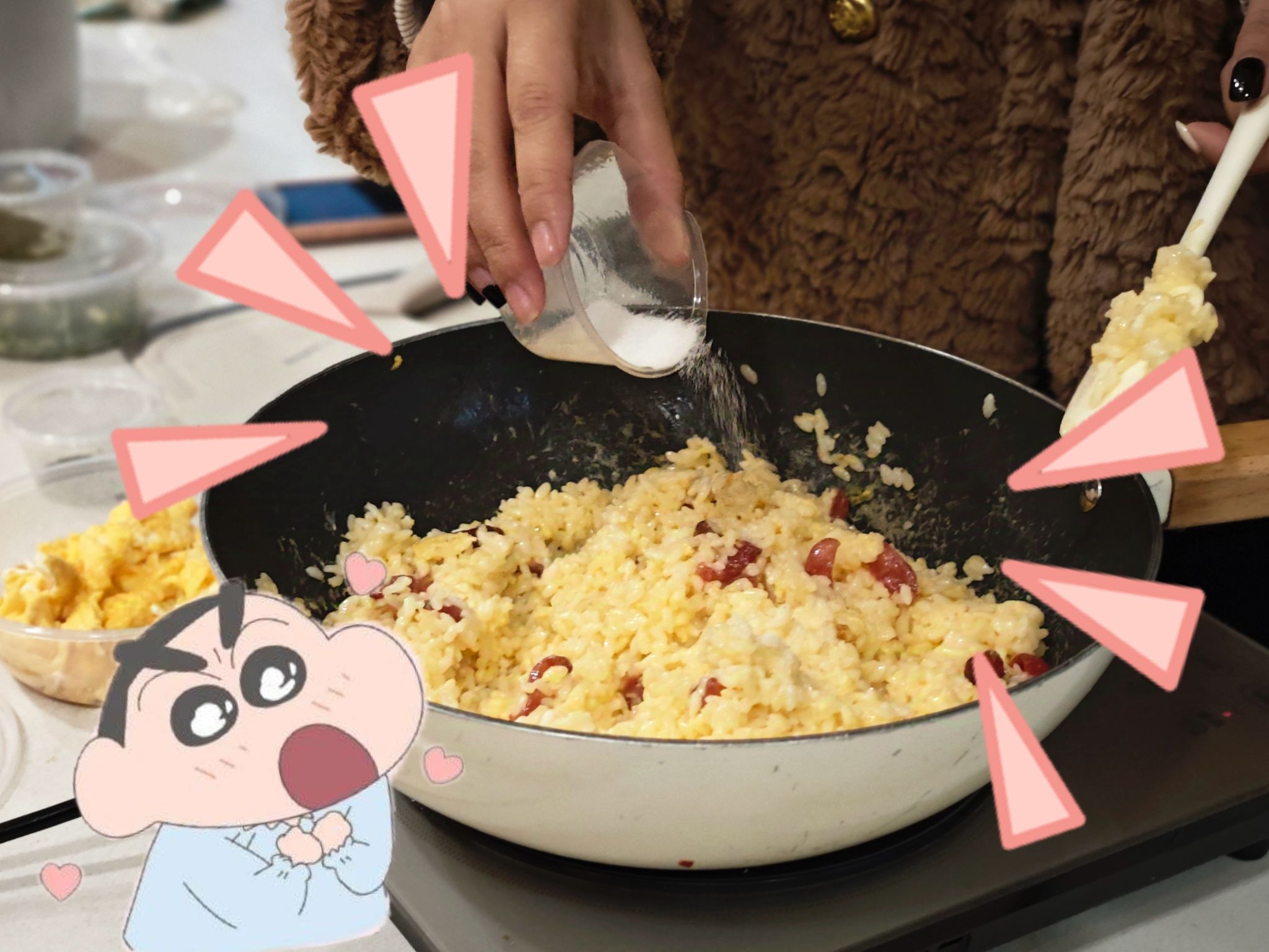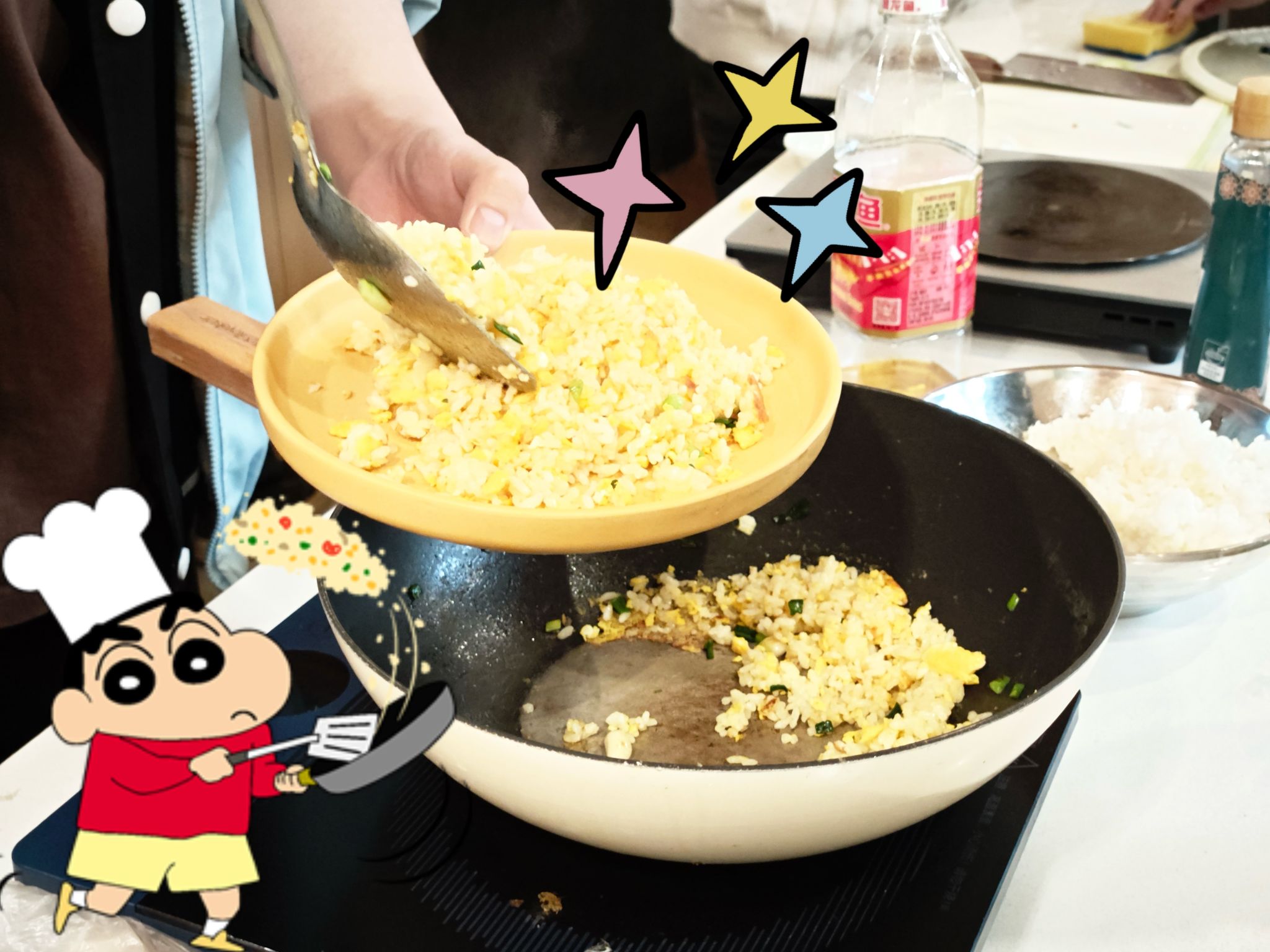 一起将目光聚焦于经典动漫《蜡笔小新》,挑战还原那碗极具治愈力的小新家蛋炒饭!《蜡笔小新》承载了无数人的美好童年回忆,在那段纯真岁月里,它始终相伴左右。动画里那碗承载着野原家温情的黄金蛋炒饭,此刻化作连接理论与实践的奇妙纽带。"动感光波!哔哔哔哔~"的搞怪配音中,主厨正跟着小新颠勺技巧,大家因对二次元的共同热爱讨论起火候掌控。
