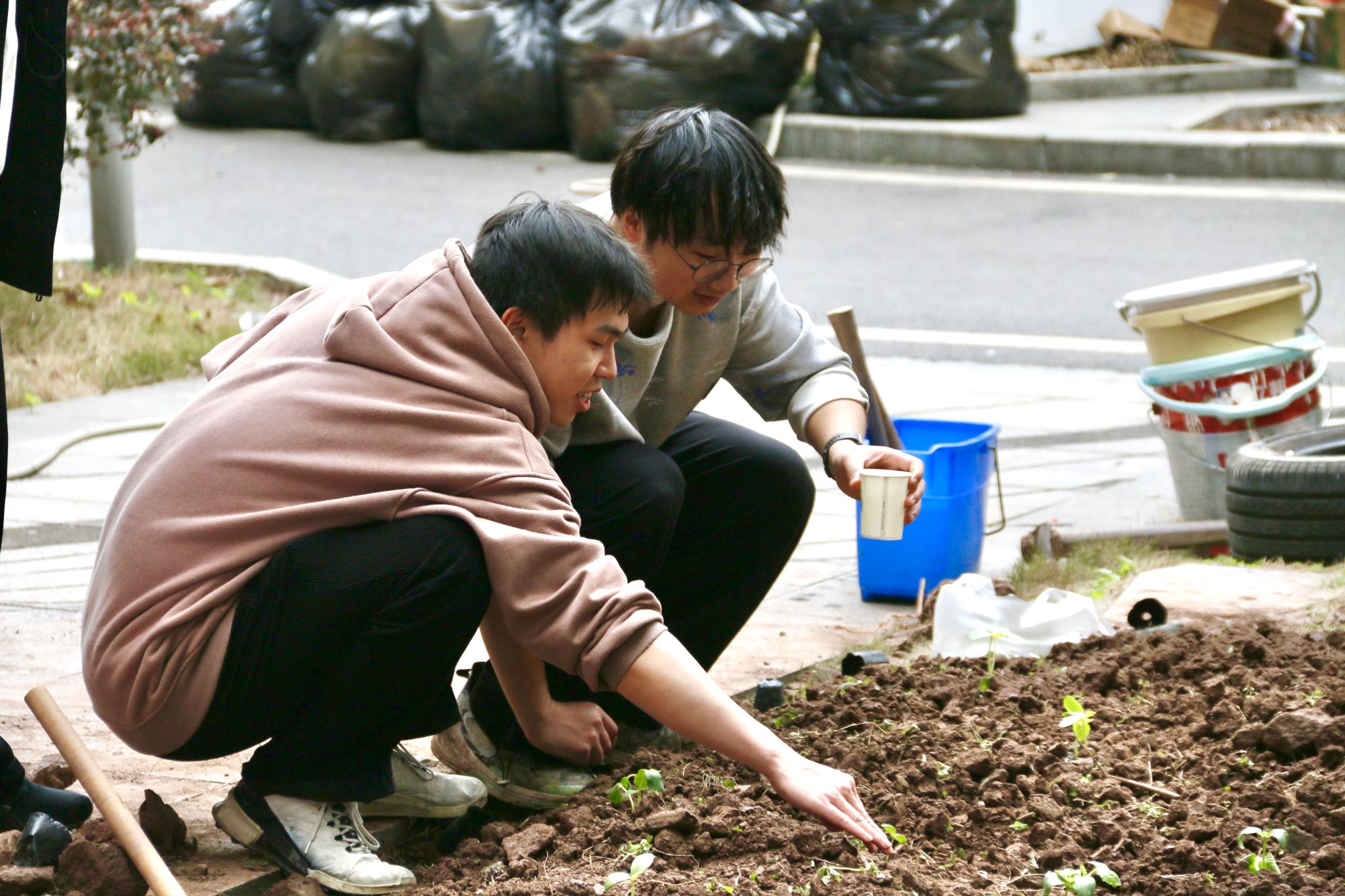 随后,李主管亲自示范教学,手把手教授同学们松土、播种、浇水的技巧。她一边操作一边讲解,强调每一步的注意事项,确保同学们能够真正掌握种植要领。紧接着,同学们五人一组,分工协作,有的负责松土,有的负责播种,有的负责浇水,现场一派忙碌景象。“亲手把种子埋进土里的那一刻,感觉特别神奇,好像种下了希望!”一位女生兴奋地说道。通过实操教学,同学们学会了种植技能,更在团队合作中感受到了劳动的乐趣与成就感。