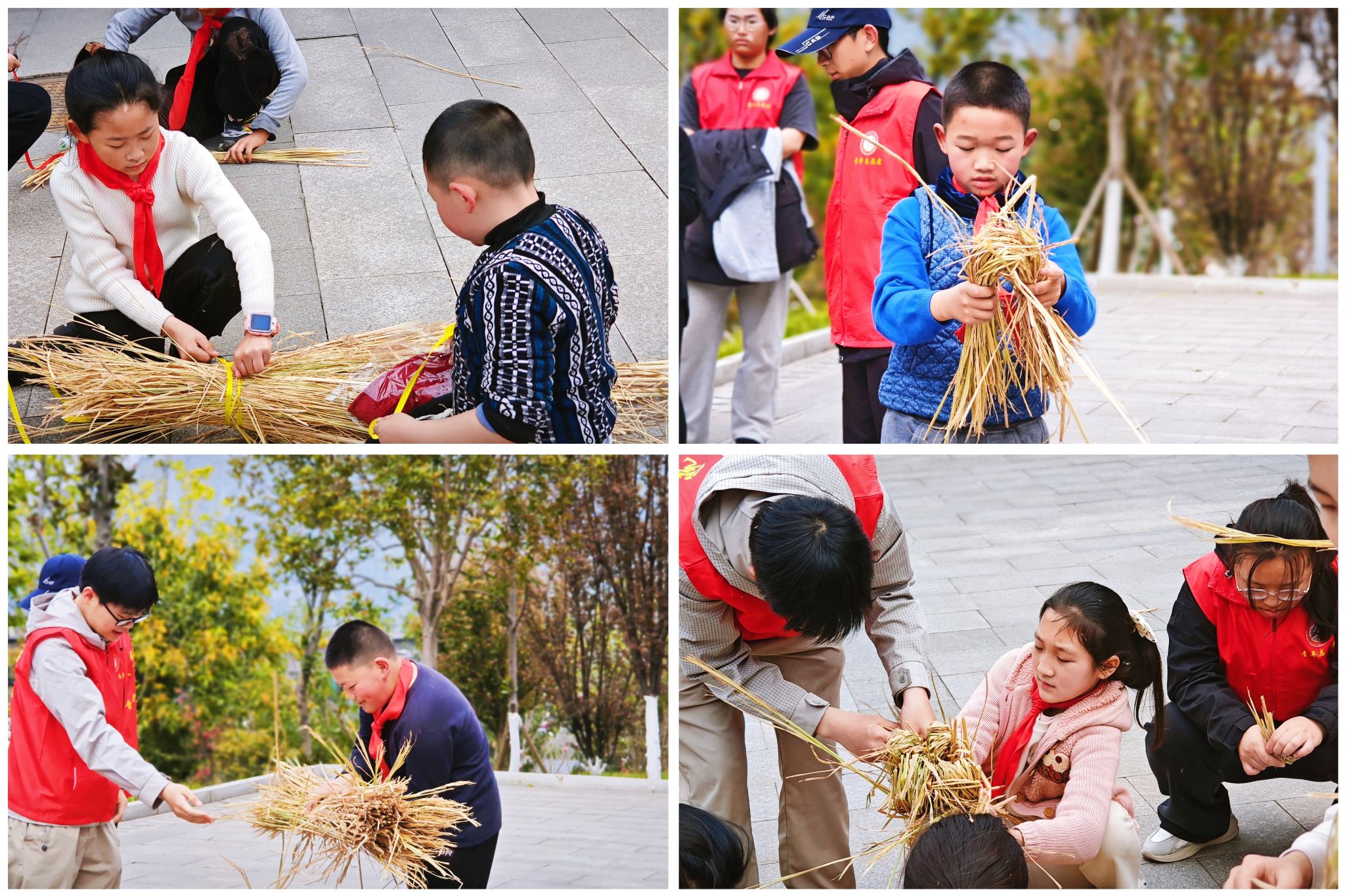 在田野上,稻草人被赋予了守护者的象征意义。志愿者们细致讲解如何挑选稻草、编织骨架并固定,孩子们兴致勃勃地参与其中,灵巧的小手穿梭于稻草之间,仿佛编织着美好的愿望。随着稻草人逐渐成形,孩子们为它们穿上衣物、戴上草帽,甚至用彩笔“画”上笑脸,让稻草人焕发生机。当稻草人挺立在田野上时,它们仿佛化身为土地的守护者,静静注视着这片充满希望的土壤。孩子们围绕在稻草人旁,用稚嫩的声音许下心愿:“希望它们保护好小苗,让它们快快长大!”这一刻,稻草人不仅是农田的卫士,更是孩子们对自然、劳动与未来的美好寄托。
