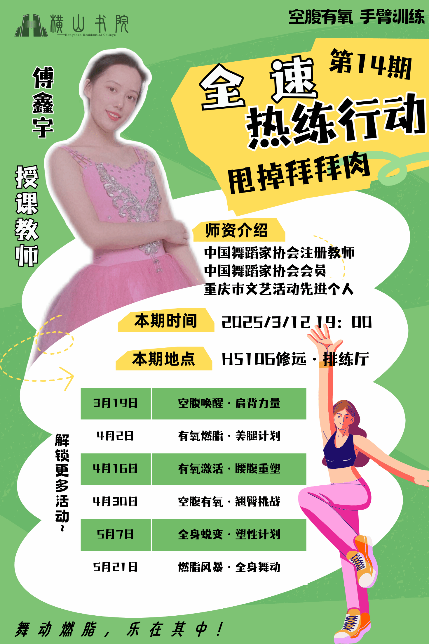 为确保全速热“练”行动系列活动更加系统化、专业化,横山书院积极整合优质资源,特邀中国舞蹈家协会注册教师傅鑫宇担任课程指导。在活动筹备阶段,充分调研学生需求,制定详细实施方案,确保课程内容兼具趣味性与实效性,本学期活动以燃脂操为核心主题,采用空腹有氧唤醒与身体各部位专项训练相结合的方式,帮助同学们逐步从基础动作过渡到完整训练计划,助力学子在科学指导下实现健康目标。