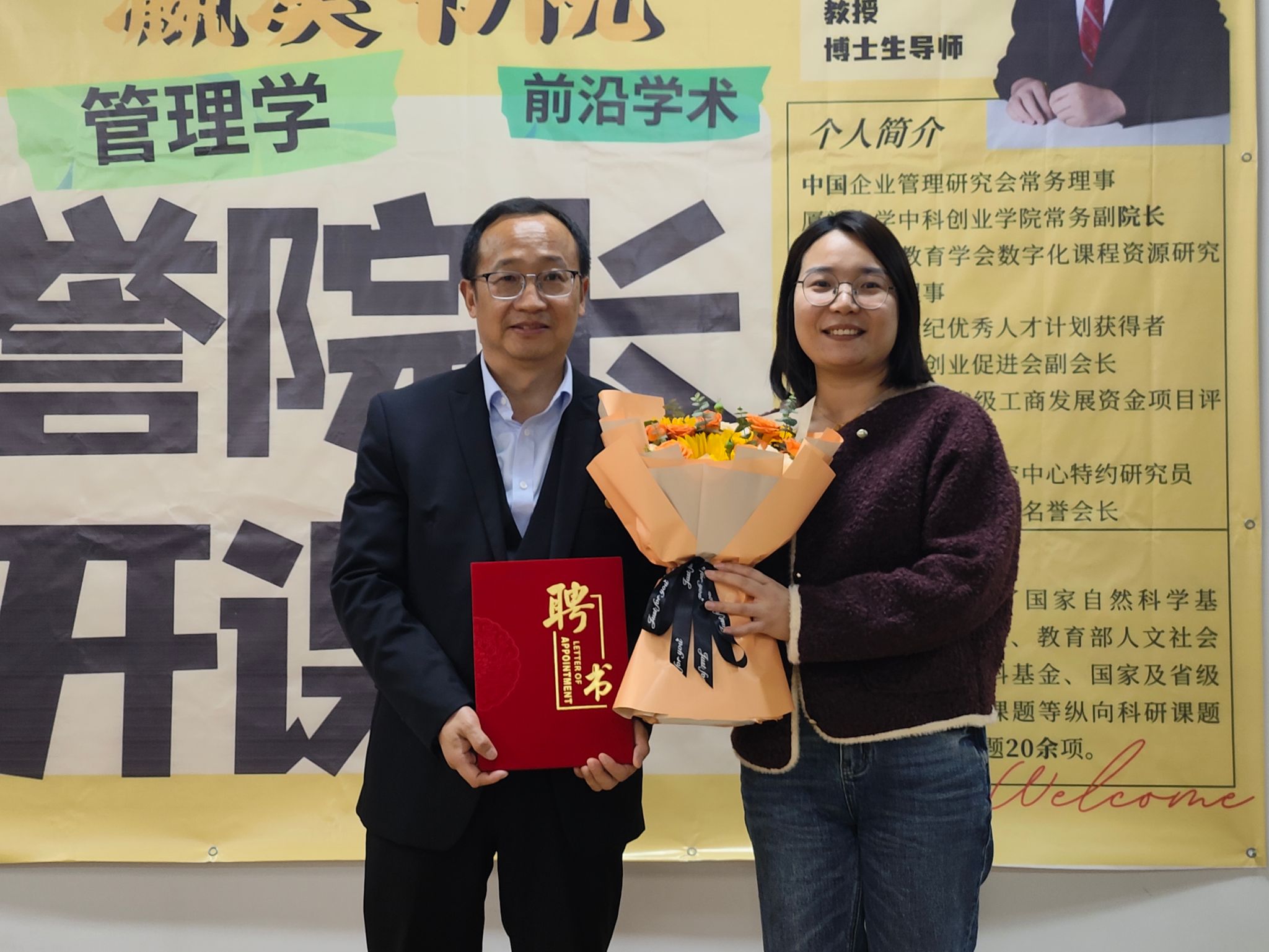 为此,瀛溪书院邀请到厦门大学管理学博士生导师、厦门大学中科创业学院常务副院长唐炎钊教授,担任其名誉院长并定期来访书院开展精品公开课。公开课开始前,重庆移通学院綦江校区书院部部长曹玉姣在聘任仪式上发表致辞,对唐炎钊教授的加盟表达诚挚的欢迎,并向唐教授颁发了名誉院长聘书。曹部长强调,优质师资是推动书院持续进步不可或缺的力量,此次聘任不仅是书院主动链接外部优质教育资源的重要举措,更是迈向更高教育品质与影响力的关键步伐。