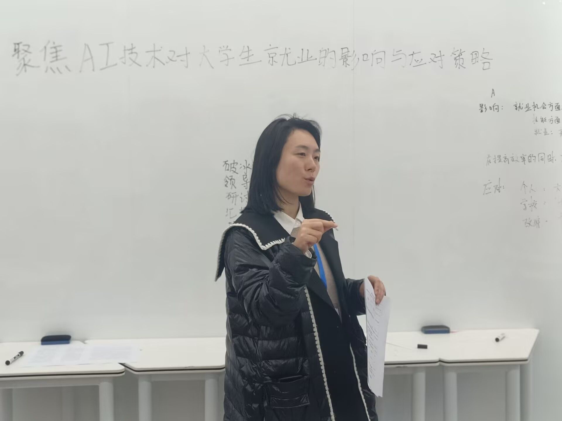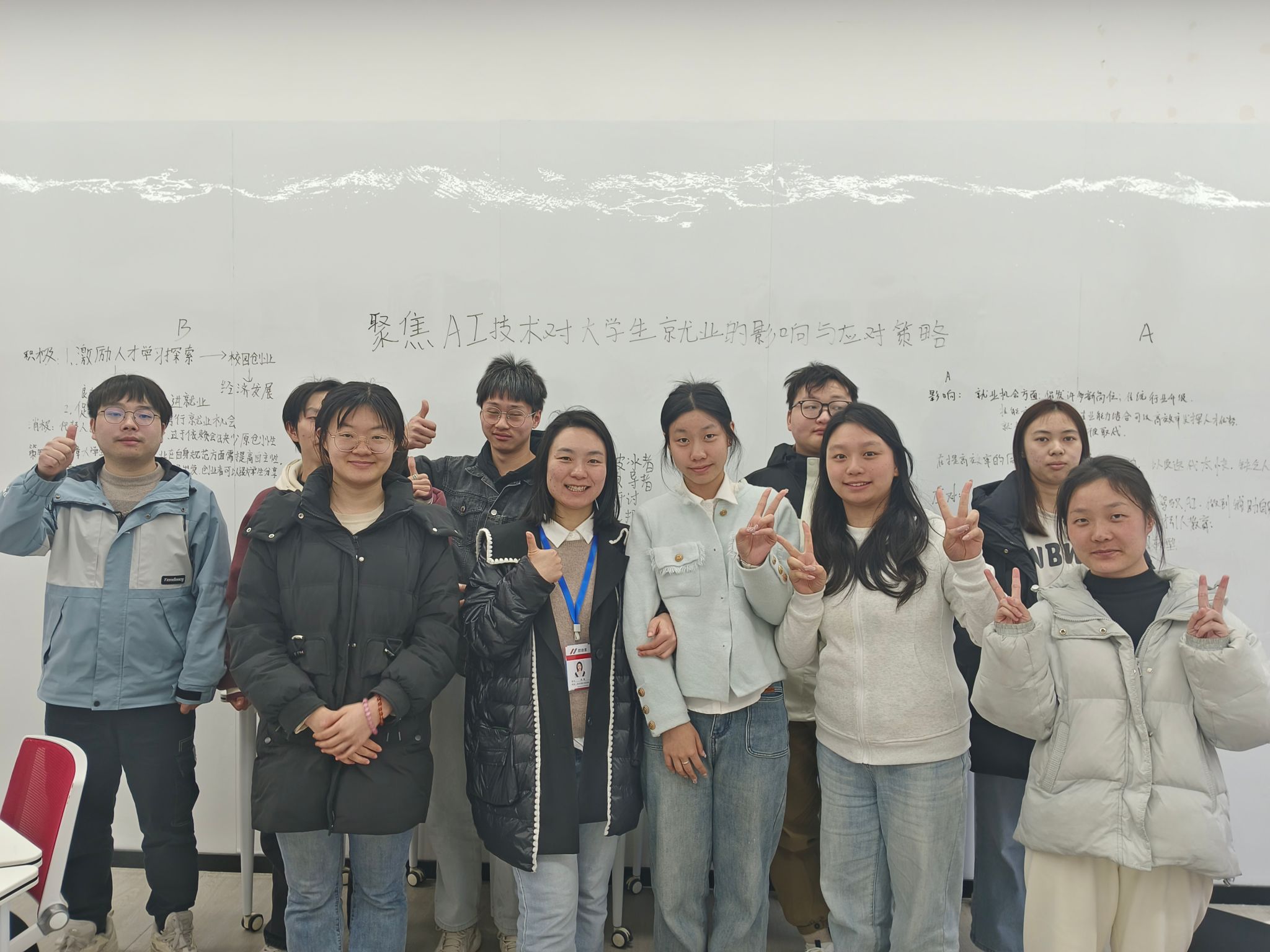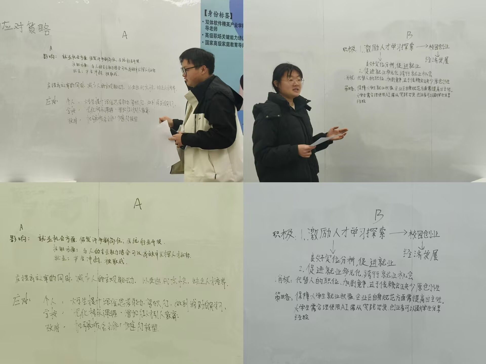 B组同学也带来了他们的思考,他们聚焦于AI技术对传统岗位的冲击。随着AI技术在各行业的广泛应用,一些重复性、规律性强的工作可能会被AI取代,这对大学生的就业造成了一定压力。对此,B组同学建议大学生应注重培养自身的创新能力、批判性思维和人际交往能力,这些能力是AI难以企及的,能帮助他们在就业市场中脱颖而出。