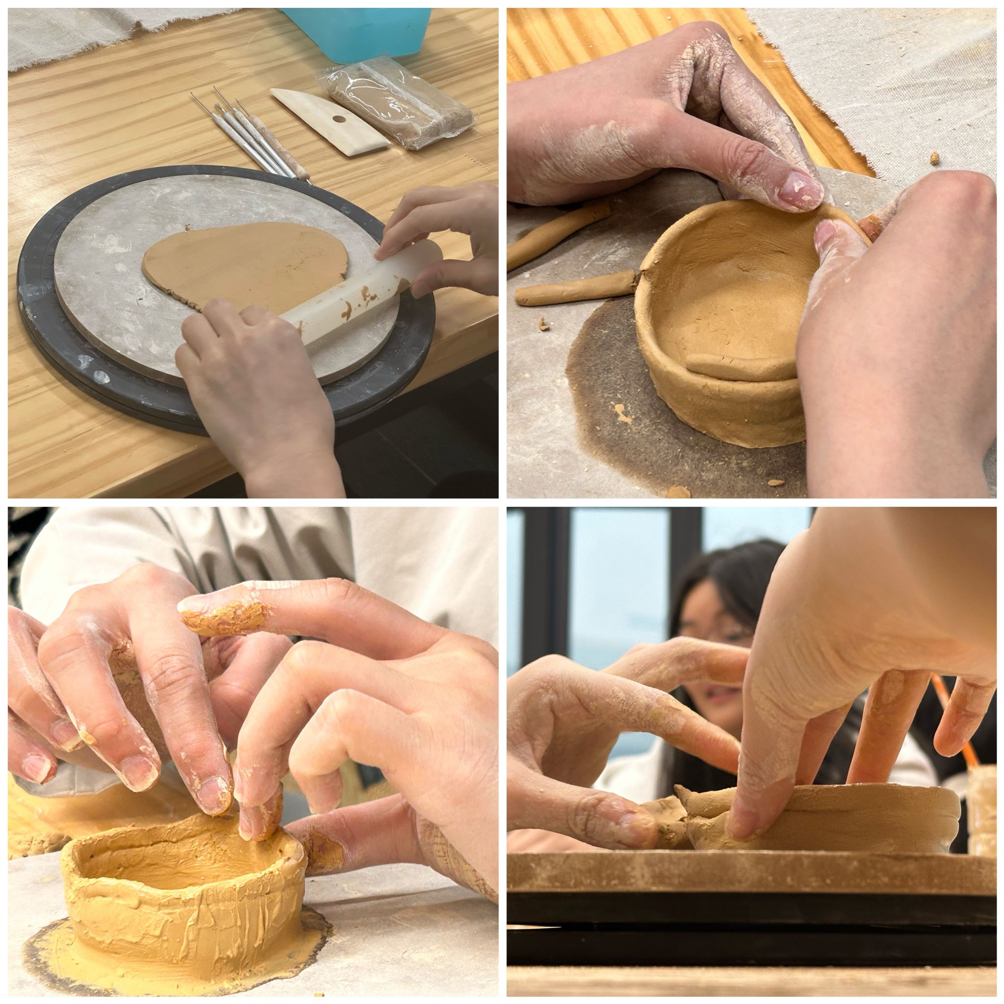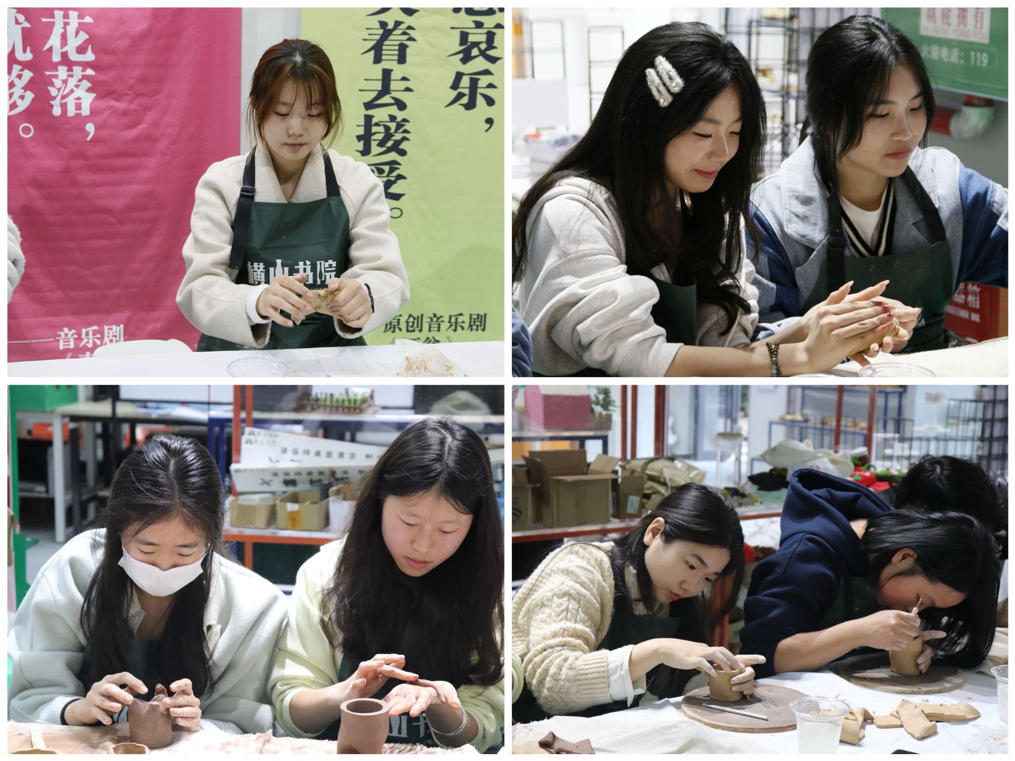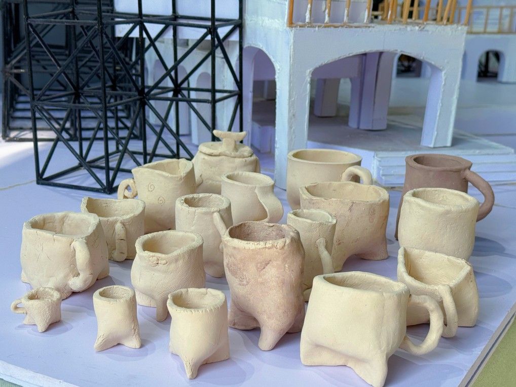 活动现场,张老师一对一指导学子们将课堂所学转化为创作实践,通过反复的揉、擀、提、收、修等工序,同学们掌握了"三分拉坯七分修"的成型技巧,经过2场沉浸式学习,每位同学都完成了从泥坯到成品的完整创作流程,虽然同学们产出的作品精细度还有待提升,但大家的创作潜力已被成功激发。未来,我们将实践多种教学的方法,形成"任务驱动-灵感迸发-精品产出"的良性循环,有效激活书院学子的文化创造力,产出更多具有创意特点的陶艺作品。