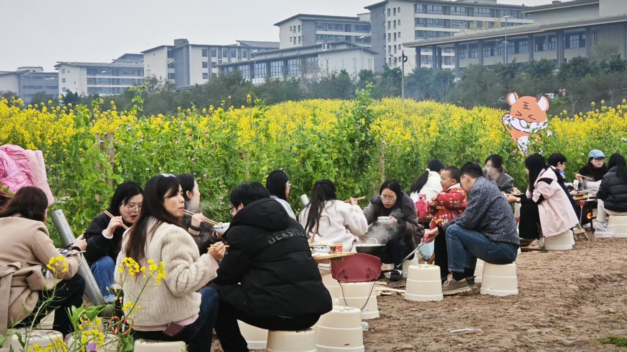 暮色渐浓,微凉的晚风拂过花海,却吹不散沸腾的热情。十余口土灶沿田埂排开,红油锅底翻滚沸腾,麻辣鲜香与花香在春风中交织。毛肚在红汤中起舞,鸭肠舒展成优美曲线,师生们围坐谈笑,举箸间尽享春日美味。这场独特的“花田火锅”不仅温暖了胃,更温暖了青春记忆。当星光点亮夜空,这场融合自然与烟火气的盛宴,成为师生们最难忘的春日印记。在重庆,赏花与火锅的完美邂逅,才是打开春天的正确方式。