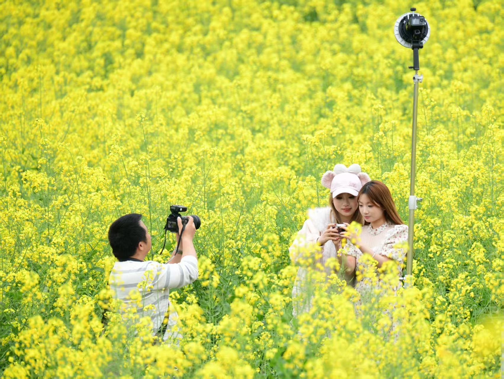 本次油菜花节创新推出“花田移动课堂”教学模式,将传统的教室授课转变为沉浸式场景教学。活动邀请綦江区摄影家协会的资深摄影师现场指导,与计算机学院映像美学工坊、戏影专业的学子们共同创作,将课堂搬到花田,实践拍摄技巧。百位摄影师,累计产出优质影像作品千余件。无人机在上空盘旋记录下金色花海的壮美画卷,与地面摄影家们捕捉的人物特写、环境人像等素材相互补充,共同构建起这场春日盛会的完整记忆。