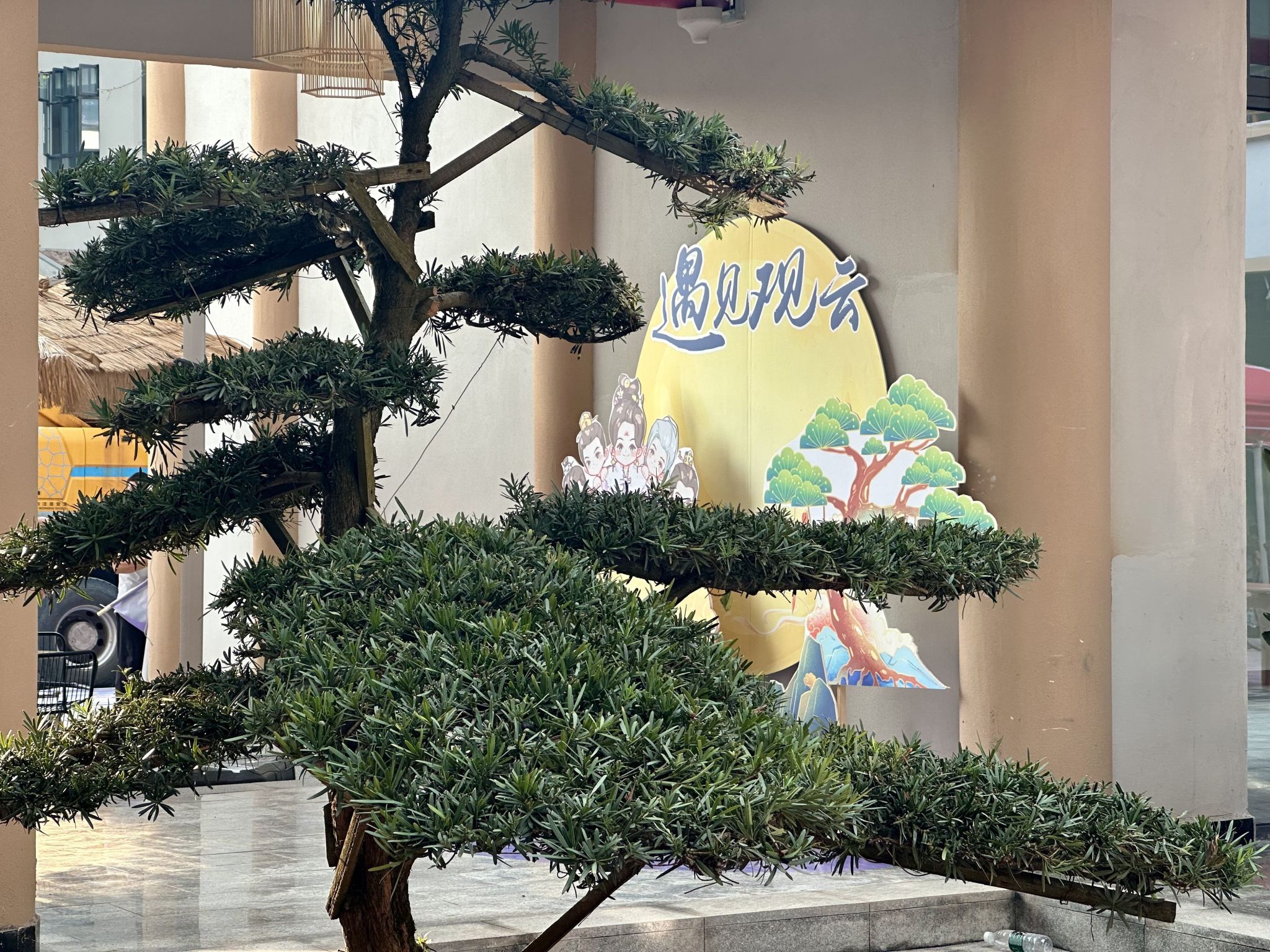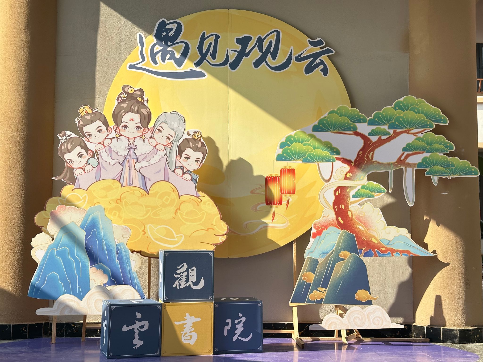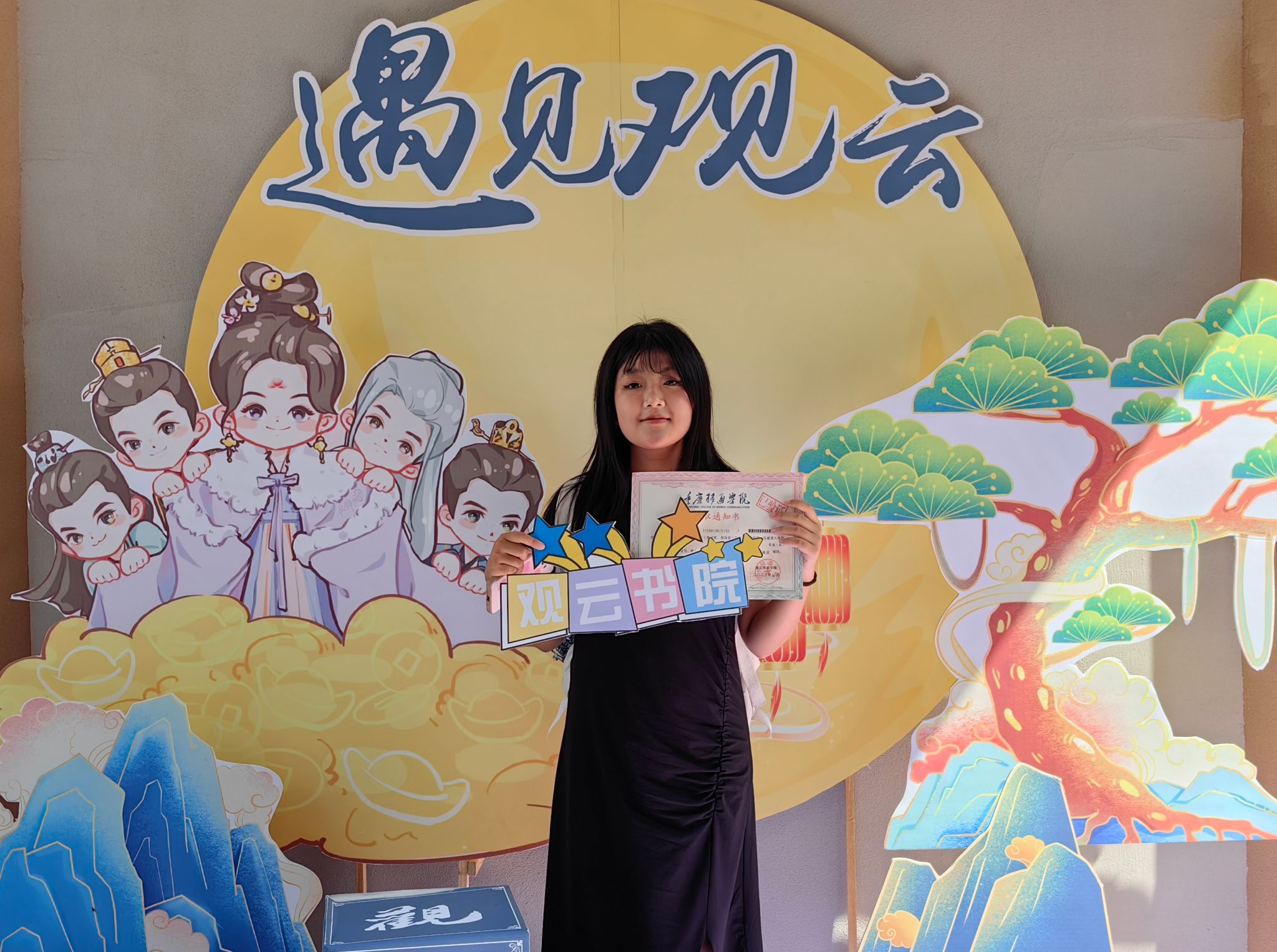 跨过巨大的迎新门栏,映入眼帘的是传统中式风格的飞檐翘角,带着观云紫的趣味标语“今年花似往年好,你是观云最好的宝!”“移通你人怪好的嘞,让我住观云啦!”融入了网络用语元素,俏皮而不失幽默,引得无数人驻足。