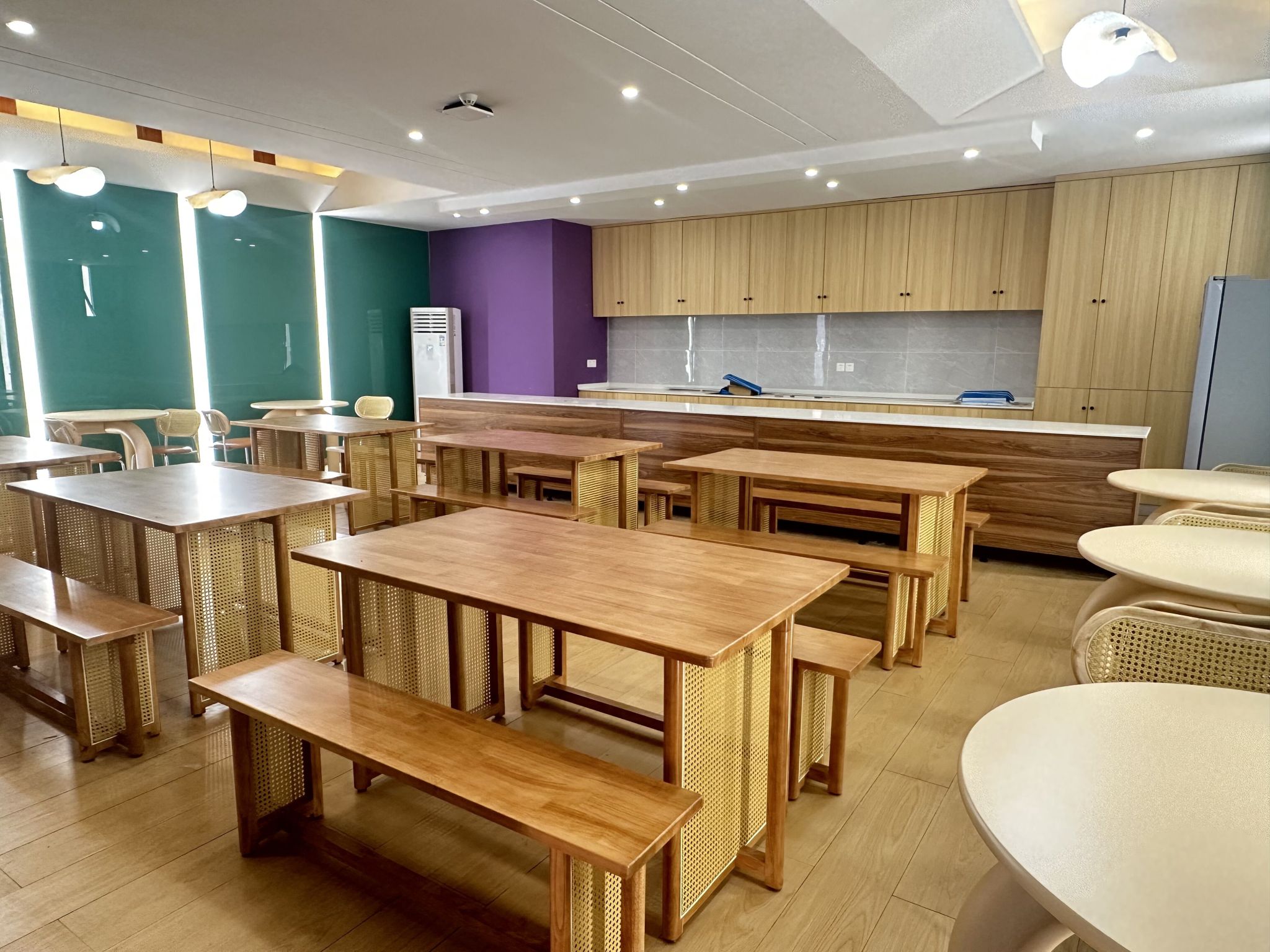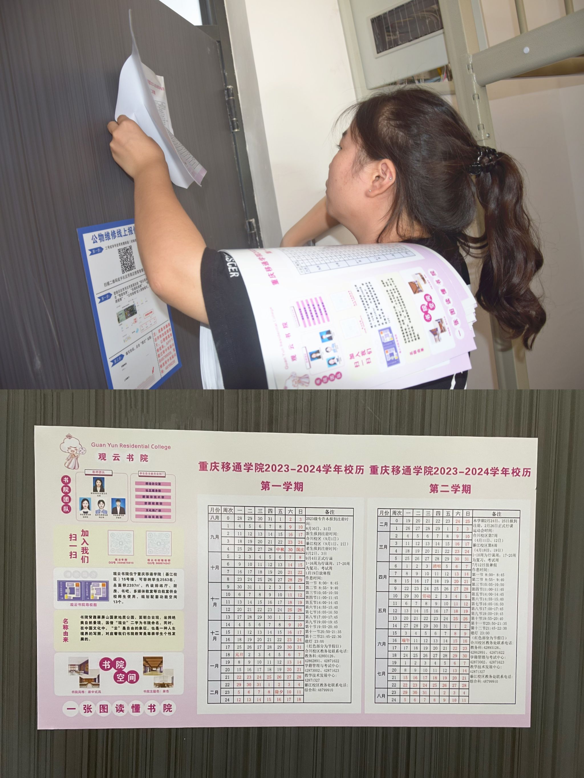 云天收夏色,木叶动秋声。踏着夏天的余韵,观云书院的迎新准备工作围绕着空间建设、氛围塑造、服务点设置等如火如荼的开展起来。观云书院作为新建成的书院之一,采取新中式的装修风格与紫色的主题色,整体与綦江校区山水园林式书院制大学格局相得益彰,尽可能地为学生提供一切开展特色教育的优质空间、平台资源与活动指导,内设排练厅、书吧、共享厨房等13间特色功能室供全校师生使用,让学生们能够体验丰富多元的校园生活,提升自身的综合素质。