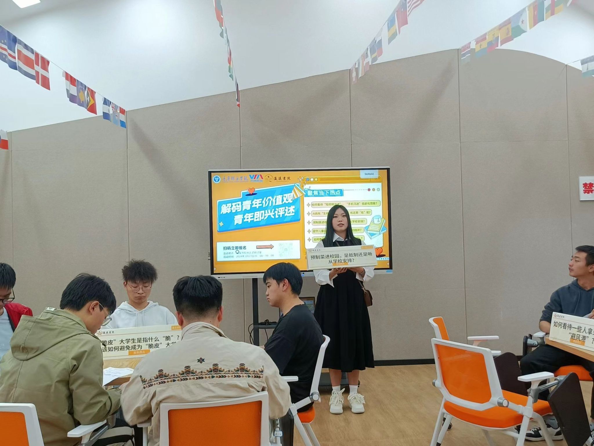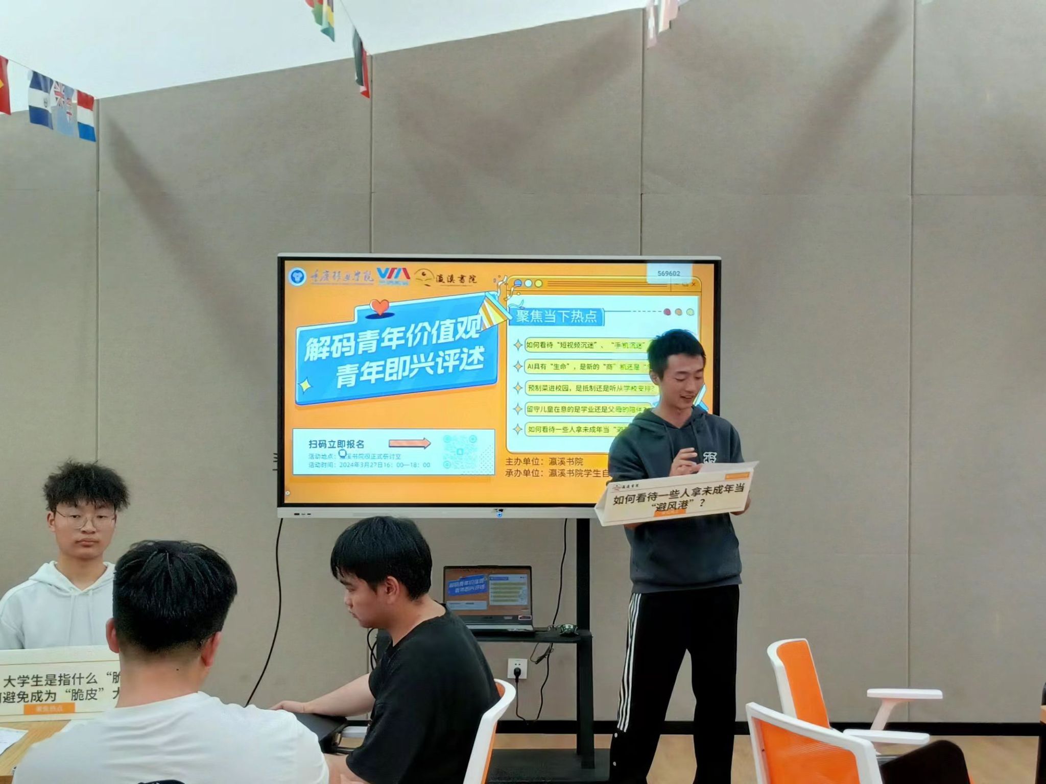当今时代,百舸争流,千帆竞发,潮涌之势涛风正劲在这个关键时期,青年塑造积极向上的价值观至关重要。为了激发广大移通学子的创造力与表达力,通过对社会热点事件、话题的研讨交流,培养其自信心与前瞻力,引导同学们更好地建立正确的人生观、世界观和价值观。瀛溪书院接续举办了“解码青年价值观”——青年即兴评述第二期活动。