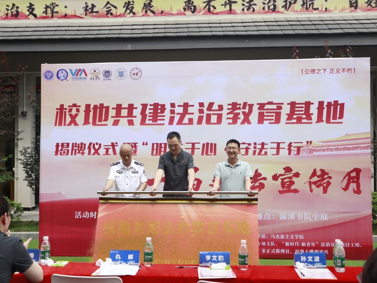 为了进一步加强校地法治共融共建,加大校外法治资源引进与提升普法专业性;促进校内法治教育资源整合,集中力量培养青少年法治人才,重庆移通学院联动重庆市綦江区人民法院、重庆市綦江区公安局,在瀛溪书院建立了校地共建法治教育基地,校内六个入驻单位参与基地共建。5月18日成功举办了校地共建法治教育基地揭牌仪式暨“明法于心·守法于行”第一届普法宣传月活动,活动累计覆盖校内近400人。