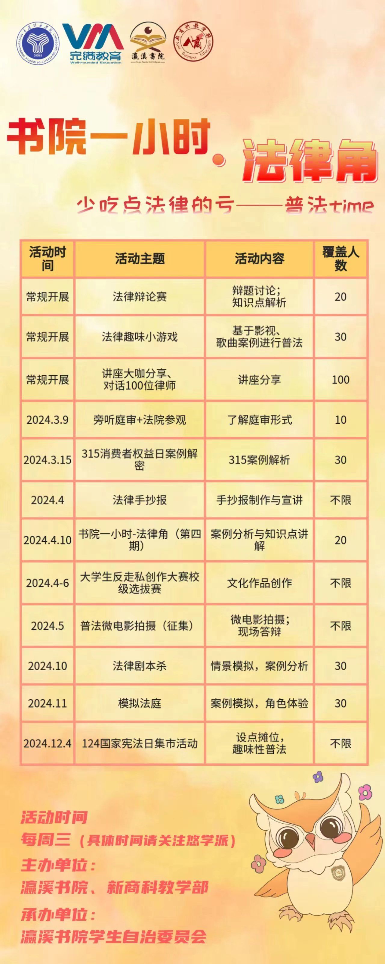 为深入贯彻落实习近平总书记全面依法治国的新理念、新思想、新战略,进一步在校园内弘扬法律精神,推动普法宣传教育,从防患于未然的预防角度,带给同学们前瞻必要的、常见的法律讯息;从案例积累与分析上,树立风险防范意识,本学期瀛溪书院法律角系列活动共开展7期,覆盖人数超过350人次,联动重庆市綦江区人民法院、新商科教学部从对话100位法律人、法律辩论赛、法条拼贴诗征集、趣味案例普法宣传等多形式、多角度开展活动,普及法治理念、弘扬法治精神。