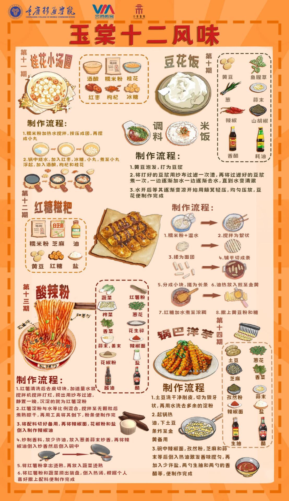 为增进书院学子对各地特色美食的深入认知与欣赏,打造良好的书院朋辈氛围,同时提升学生的认同感、归属感和价值感,本学期玉棠书院以“家文化”为依托,以“半糖煮艺烘焙坊”为主阵地,以“与全校师生分享重庆的味道”为主旨,焕新“玉棠十二风味”系列活动,通过磨豆花·品味豆花饭、酿桂花·桂花小汤圆、打糍粑·红糖糍粑、磨红苕·红苕酸辣粉、挖洋芋·锅巴洋芋等重庆特色美食的制作,带领书院学子感受舌尖上的重庆,在书院社区中、在味蕾的盛宴中,领略到中华美食的博大精深与地域风情的丰富多彩。