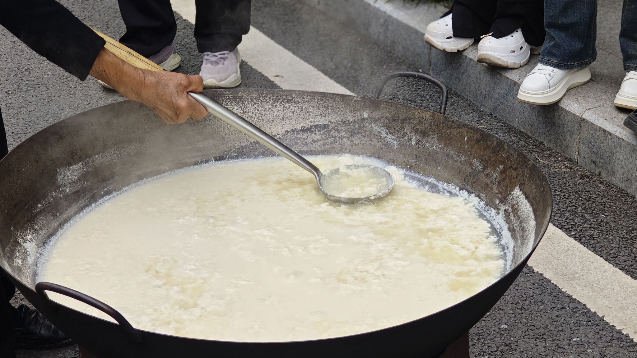 接着就是非常关键的一步—点卤水,卤水多了豆花味苦,卤水少了豆花不成形。鹿婆婆为大家展示了点卤水的技巧,将稀释后的卤水缓慢地倒入豆浆中,同时用勺子轻轻搅拌,使卤水与豆浆充分混合。乳白色的豆浆逐渐呈现絮状,将一部分放入铺垫好纱布的豆腐模具中压制豆腐;另一部分留在锅内完全凝固形成豆花,“窖水”变得更加清澈。