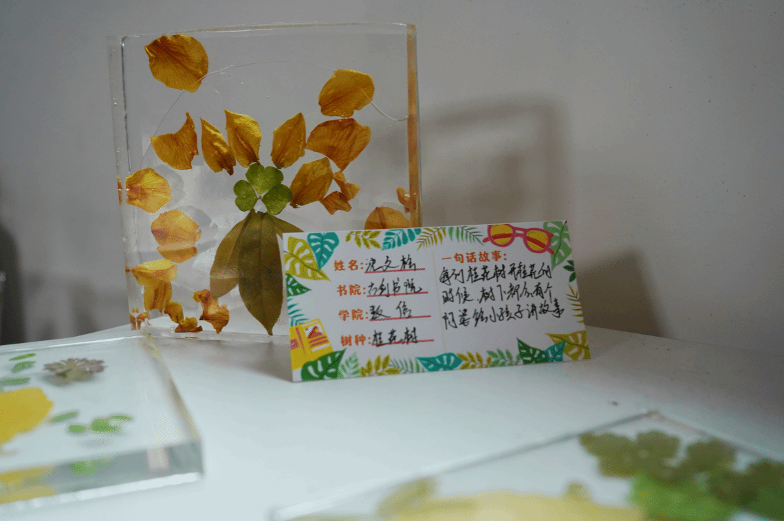 古剑书院为学子们准备好滴胶和模具,引导他们将家乡的叶片转化为滴胶艺术品,并写下自己与家乡叶的故事,用滴胶将这段家乡记忆封存,展示在家乡的文化展示区中。有的学子在叶上绘制自己的名字,以此与家乡紧密相连。