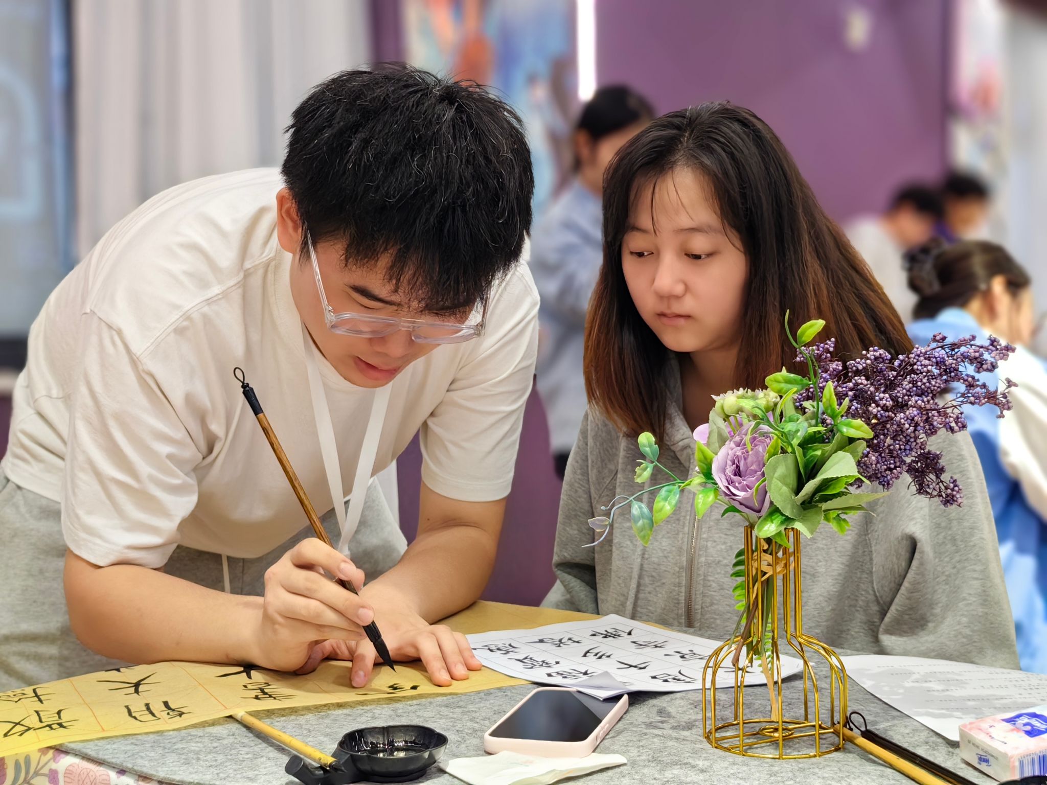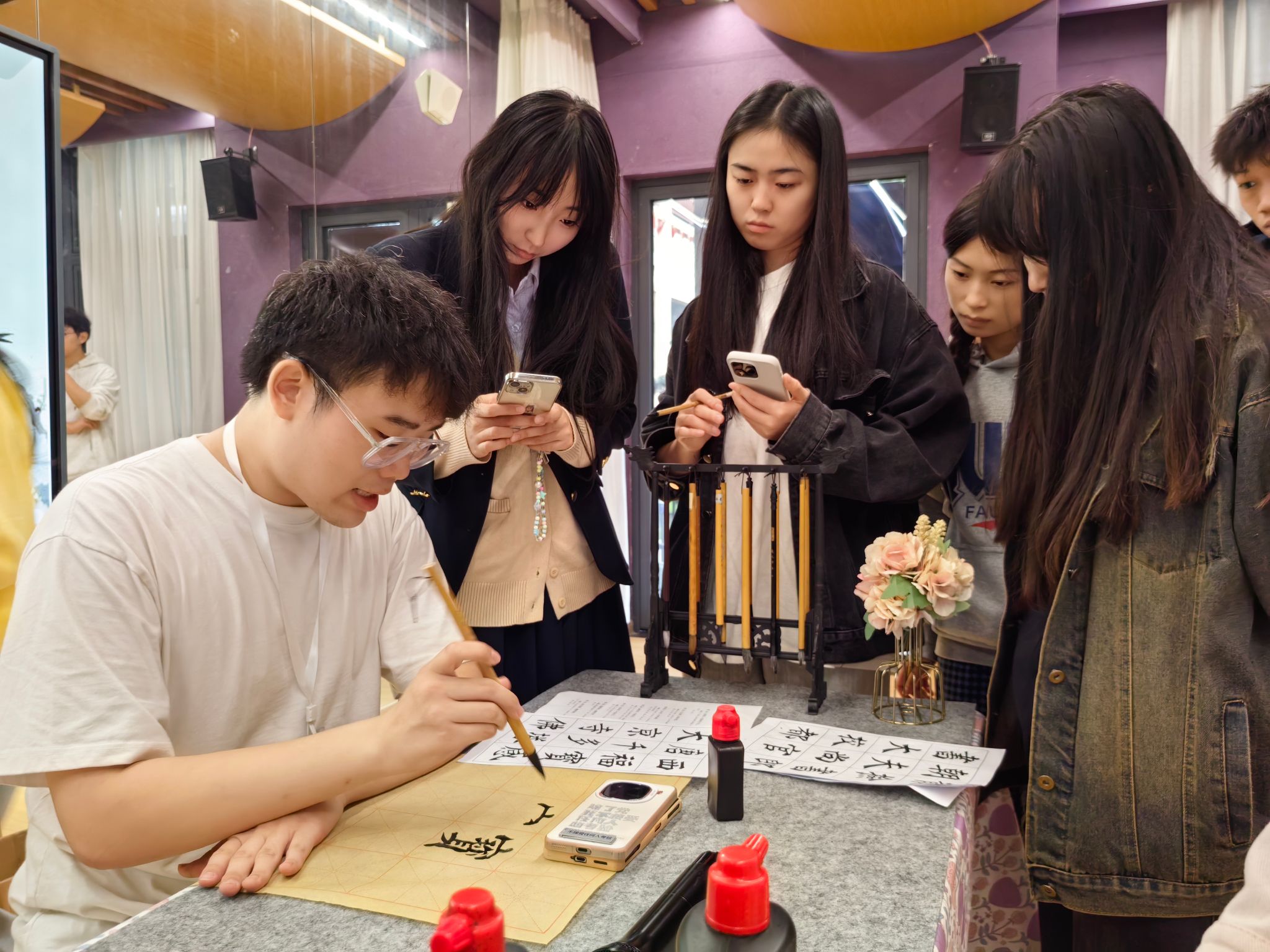研墨、挥毫,当墨线出现在纸张上,开合疏朗,荡出笔锋,同学们就开始与颜真卿笔会。为弘扬国粹之美,给同学们提供一个感受书法艺术魅力的平台,观云书院联合青花墨字书画社,于11月1日在观云书院GY106夏至·排练厅,成功举办“妙笔丹青绘古今——书法体验课第8期”活动,本期活动以“颜体结构掌握”为主题。