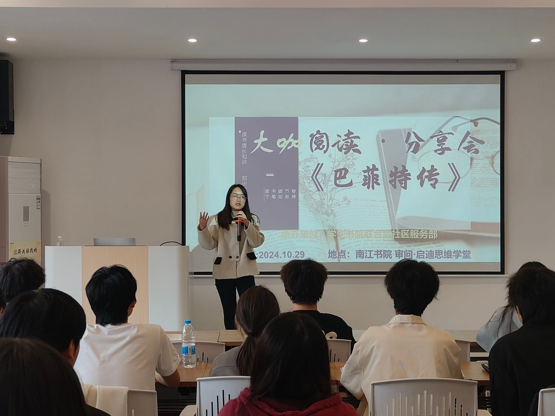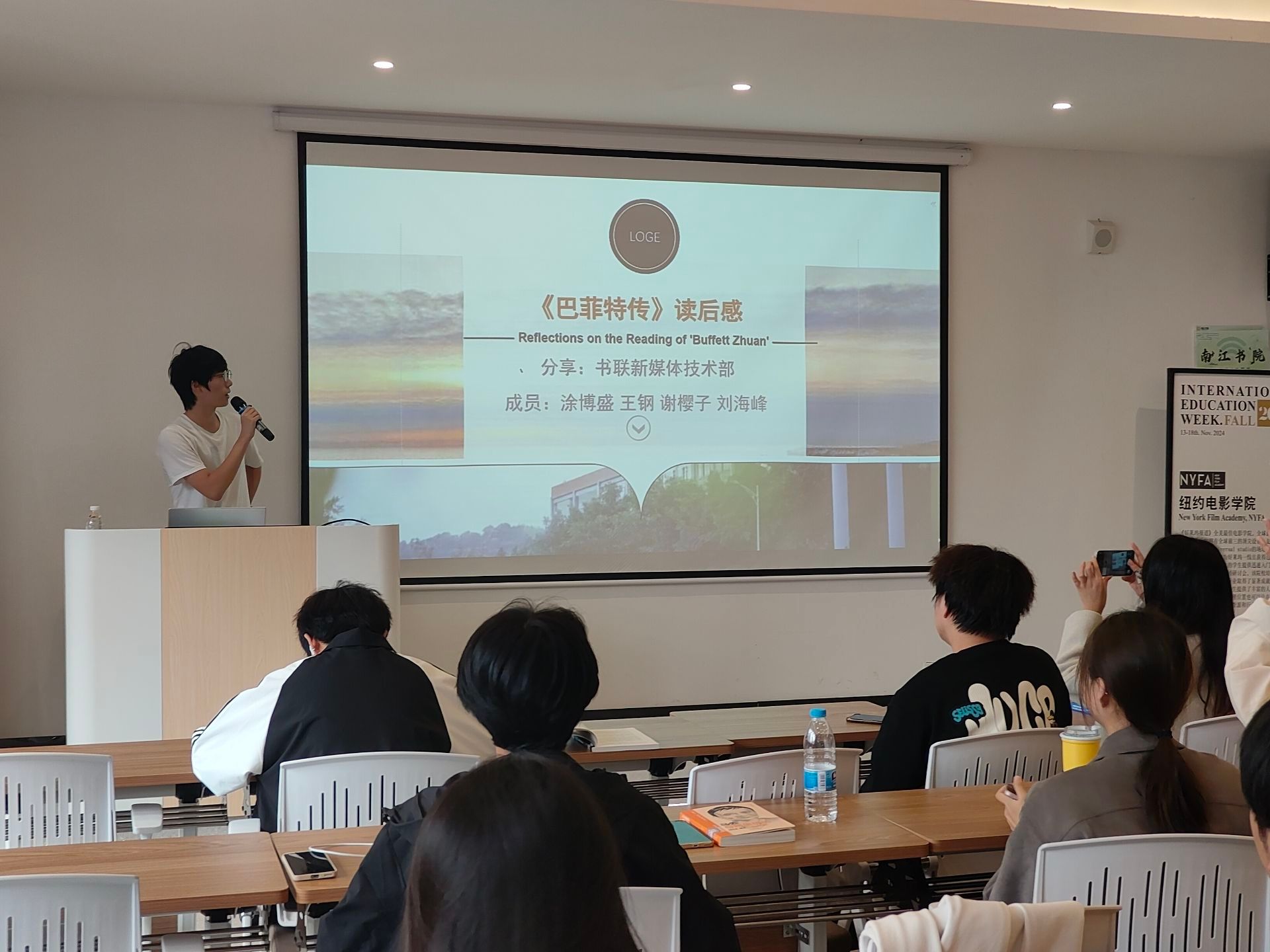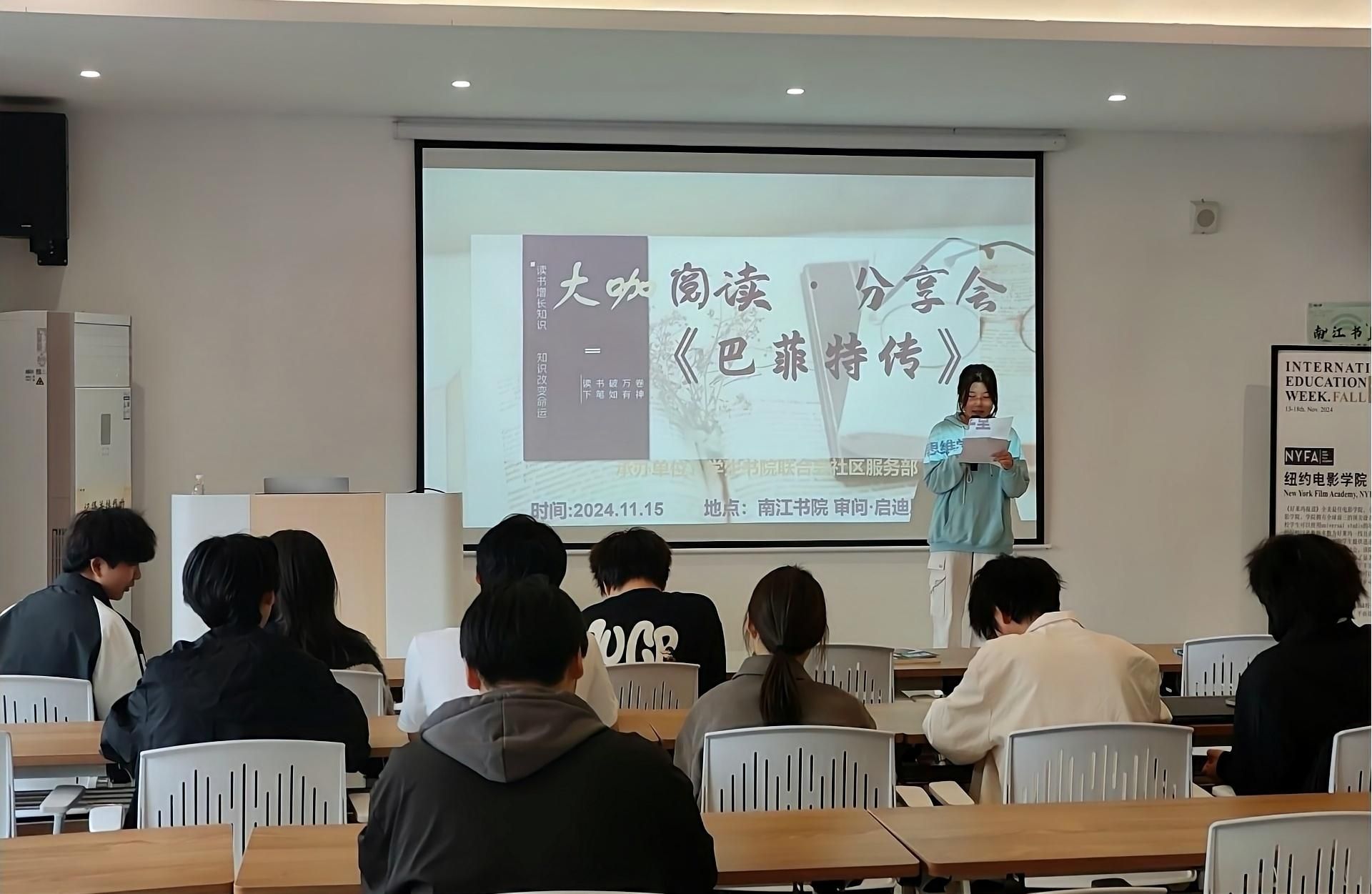 为深入践行我校“四位一体双院制 + 特色课程”办学理念,紧扣“培育信息产业管理人才”的核心育人目标,着力培养书院学子勤读、会读、善读的素养,一场以《巴菲特传》为焦点的大咖传记阅读分享会于 2024 年 11 月 15 日星期五在南江书院审问·启迪思维学堂盛大举行。此次活动由社区服务部的夏雪莲主持,众多书院学子齐聚一堂,共赴阅读与思想交流的盛会,分享彼此的感悟与心得。