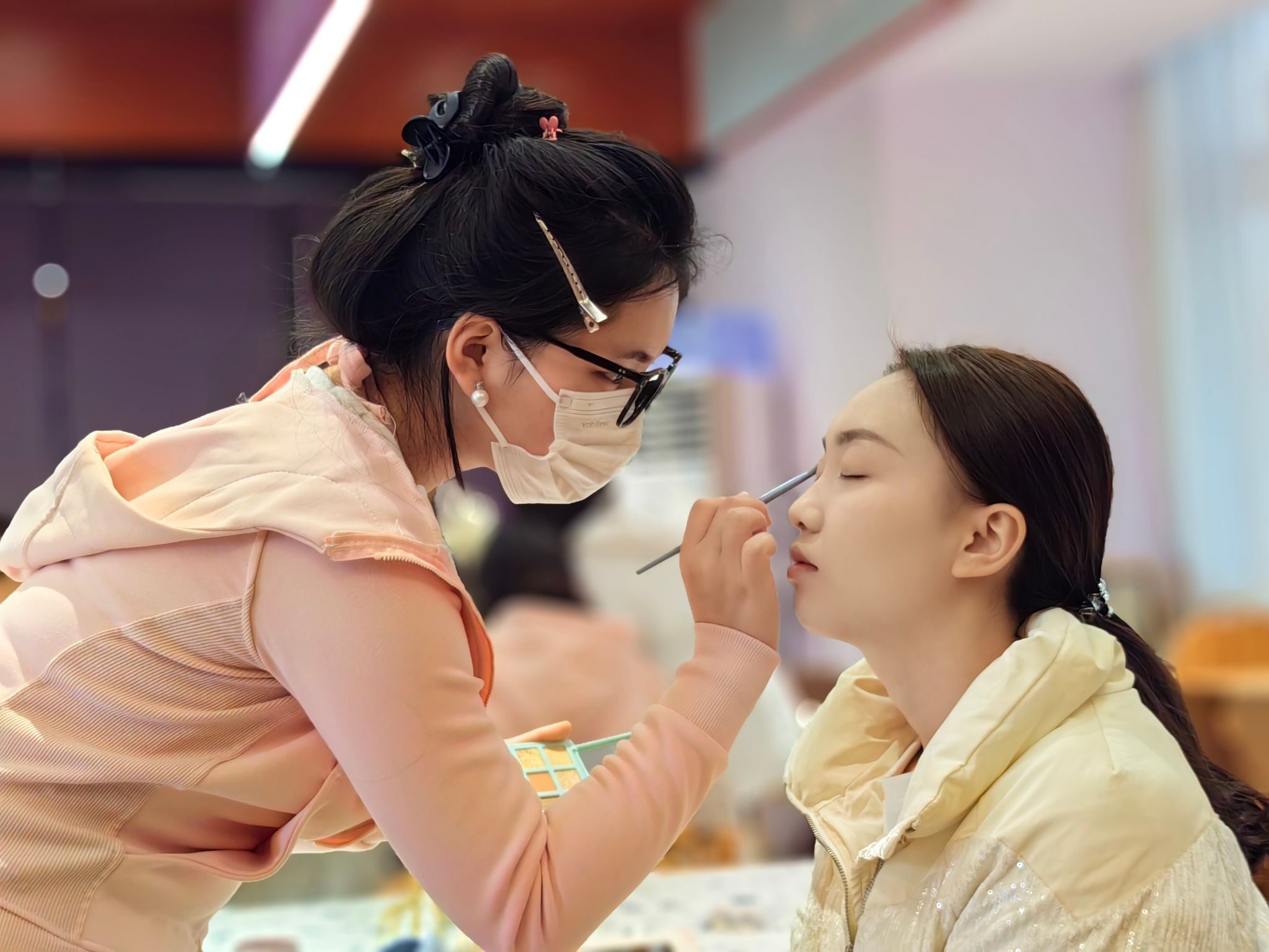 同学们抹胭脂、画黛眉、贴花钿、点面靥、描斜红、涂唇脂。大家一边化妆,一边交流心得,时不时上前观察演示组同学的动作,初次化妆的新手小白也在教学与练习中画出满意的妆容。一笔一划间,同学们仿佛穿越层层雾霭,去拥抱那千年之前的盛世。