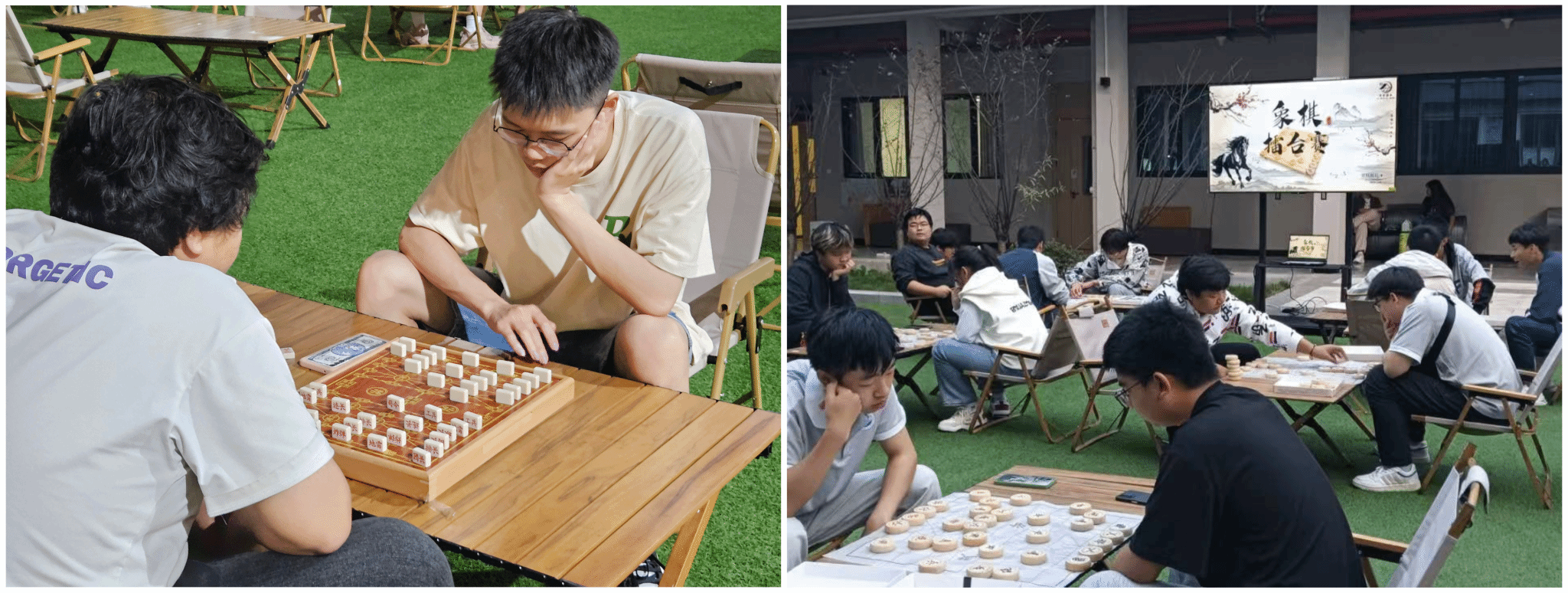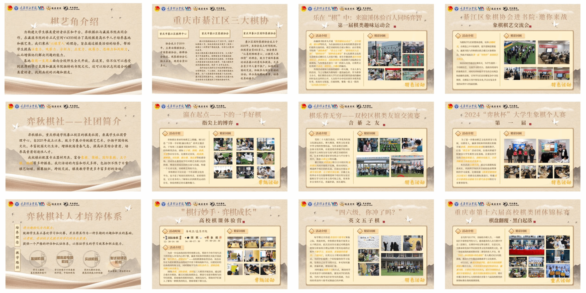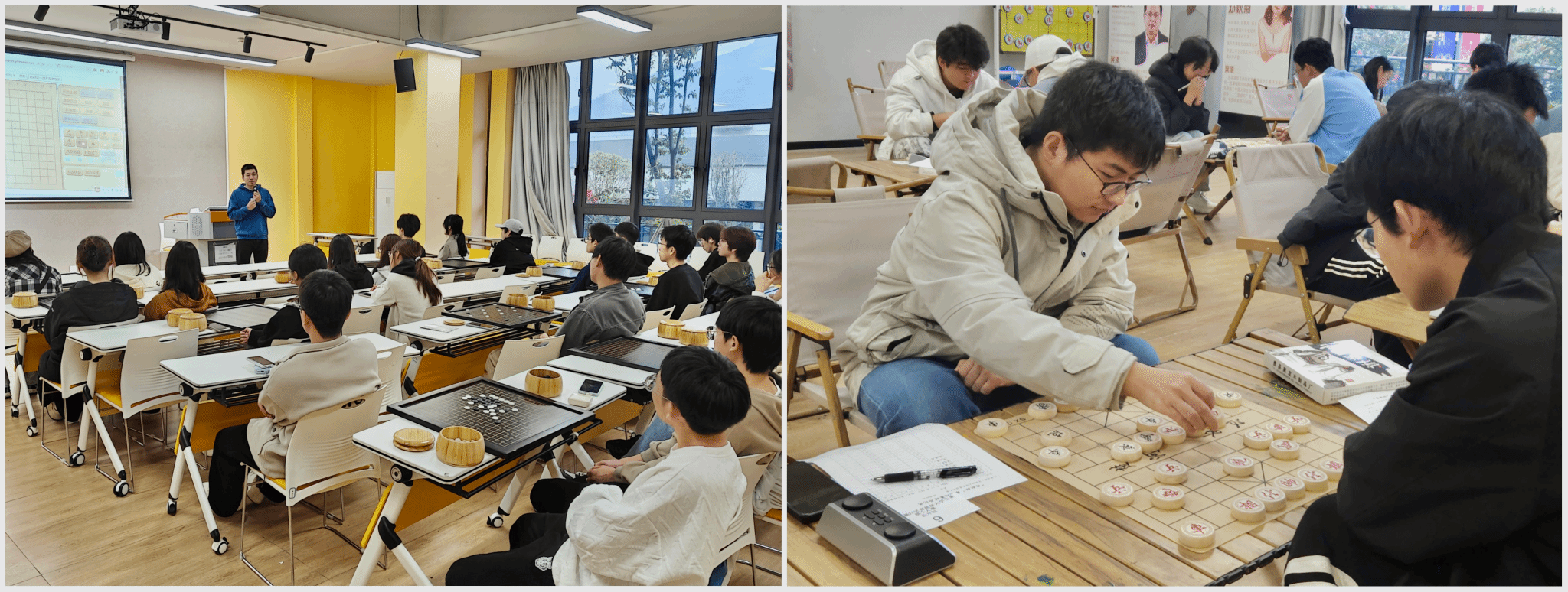 此前,瀛溪书院和弈秋棋社就以课程教学、朋辈交流、赛事活动和社会实践作为棋类人才培养模式,为学生夯实基础、拓展经验、巩固技艺,在“棋艺角”育人空间开展了一系列丰富的棋艺活动。在这之中,包括“下得一手好棋”——棋艺对弈交流会、“棋行妙手,弈棋成长”——高校棋课体验营等常规活动,通过训练营、挑战赛等多元形式巩固 学生巩固学生基础知识、提升技艺;“四六级你冲了吗?”——英文五子棋对抗赛、“合綦之友”——重庆移通学院双校区第一届五子棋友谊联赛、“百人同台竞技”——棋类趣味运动会、“滴胶象棋制作”等特色活动,为学生搭建兴趣平台,促进交流;全国大学生围棋邀请赛、2024-2025年高校棋类迎新杯、重庆市第十五届和十六届高校棋类团体锦标赛等重点赛事,提高学生比赛水平、丰富经验;2024年全国业余棋王赛重庆赛区决赛和2024重庆第六届“山城杯”象棋赛等校外赛事,参与赛事协助,助力学生成长。目前,“棋艺角”累计开展活动77余次,覆盖人群6900+,连续两年获得年度优秀学生社团称号,致力于成为本校最具影响力的社团之一。在活动与赛事的助推下,各方对于高水平棋手和高质量师资的需求日益迫切,瀛溪书院以此为契机,联合重庆移通学院弈秋棋社及綦江区三大棋协,链接校内、校外棋类教育资源,实现资源共享、优势互补,高校棋类高水平人才培养基地也应运而生。