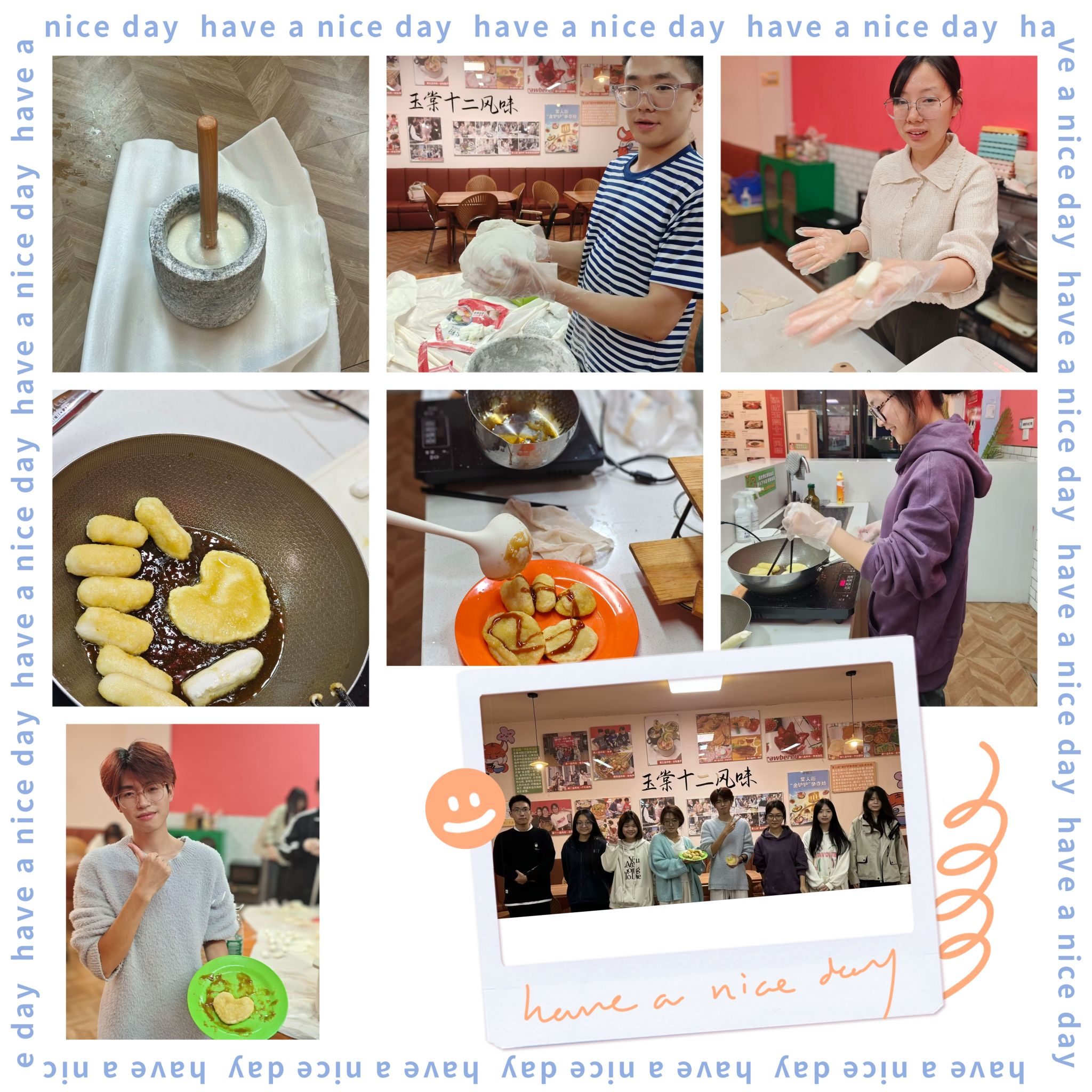 学子们满怀热忱,开启这场手作红糖糍粑的美食征程。学子们将糯米蒸至软糯,趁热倒入石臼,高高抡起木杵,一下又一下有力地捣下去,每一次撞击都伴随着糯米的黏性释放,欢声笑语也在这此起彼伏的捣糍粑声中交织回荡,仿佛将平日里的学业压力一并捣碎、驱散。红糖与水混合再小火慢熬成糖浆,将炸好的糍粑捞出,趁热浇上熬得浓稠欲滴的红糖浆。金黄与红亮相互映衬,糯香与甜蜜相互融合,视觉与嗅觉的双重冲击,让在场之人无不垂涎欲滴。糯香甜已然成为学子们青春记忆里一抹难以磨灭的甜蜜亮色,也见证着重庆传统美食带来的欢乐与成长。