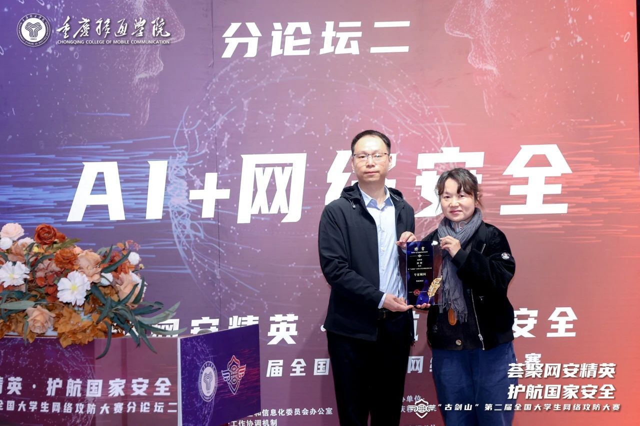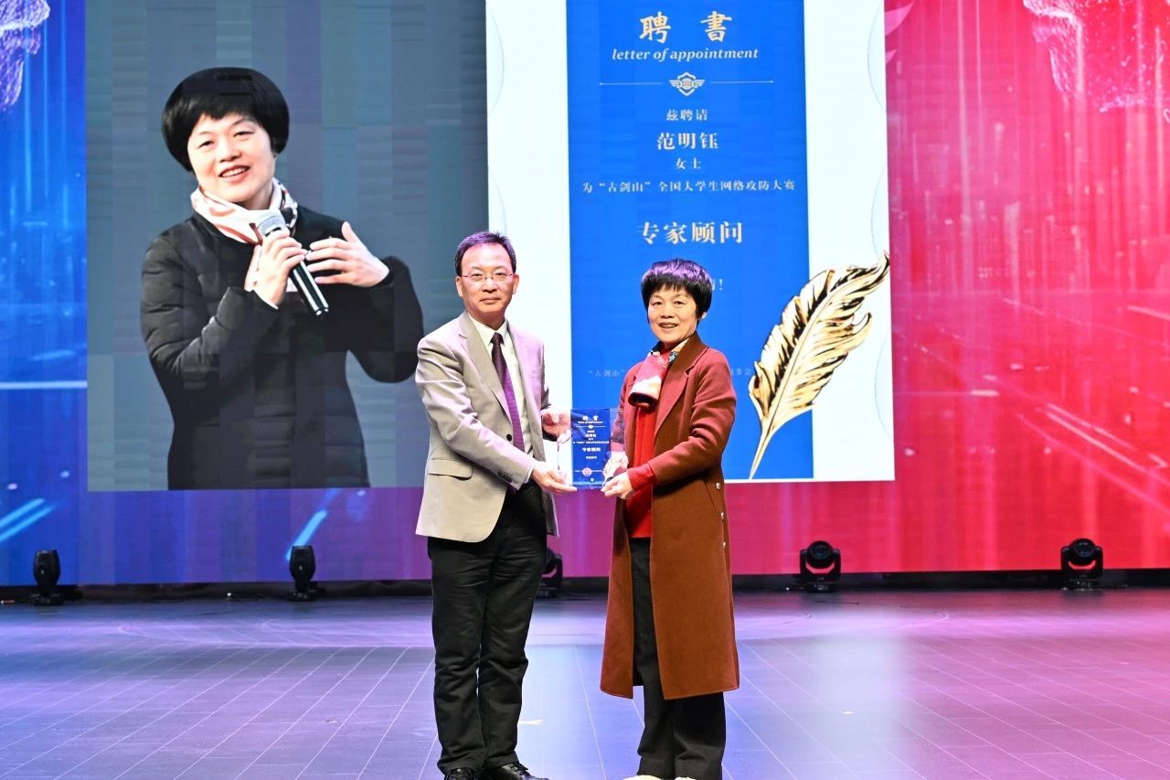 (重庆移通学院校长吕翊为范明钰教授颁发“古剑山”全国大学生网络攻防大赛专家顾问聘书)