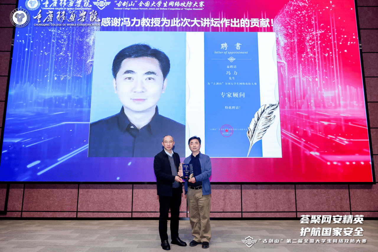 (重庆移通学院校长吕翊为黄广斌教授颁发“古剑山”全国大学生网络攻防大赛专家顾问聘书)
