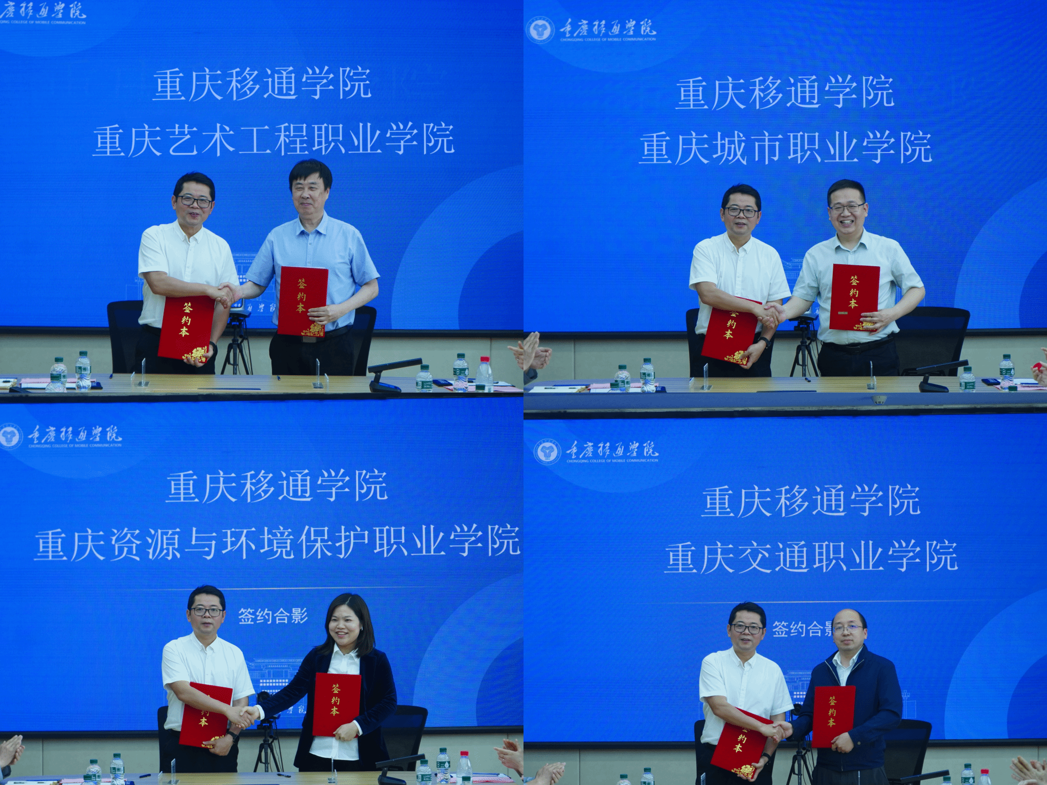 签约仪式上,四所院校代表围绕资源共享、优势互补展开研讨并达成共识。重庆艺术工程职业学院副校长陈和平高度认可我校产教融合与创新育人模式,表示将优化选拔机制推动培养方案落地;重庆城市职业学院副校长杨敏赞赏我校软硬件实力强,提议加强经验互鉴;重庆资源与环境保护职业学院校长助理王琴香强调将依托我校大数据专业优势深化合作;重庆交通职业学院教研室主任李煜果提出以数字媒体技术等专业为抓手,协同推进学生就业。各方一致表示将深化协作,共同夯实协同育人基础。