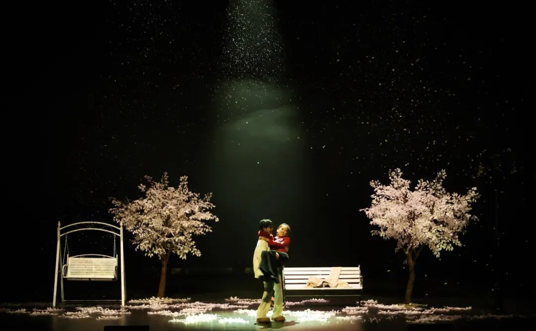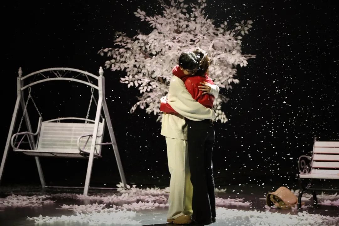 “李书航的诗歌与陈晓兰的药瓶,既隐喻浪漫与生存的永恒博弈,更指向系统性压迫下的人性尊严挣扎。通过冰冷银行卡与温暖围巾的意象对冲,我们希望通过这部戏,撕开‘爱情至上’的粉饰,迫使观众直面社会现实的残酷。”导演王海鸣与张文瀚以极简的雪景美学构建舞台,将秋千、灯光转化为情感教育载体,传递“生存不灭人性”的价值观。“希望引导青年在角色共情中锤炼批判思维,从跨学科视角审视个人与社会的关系。”历经一个月的创作打磨,《冬》不仅是一场艺术审美的淬炼,更是一堂责任意识的觉醒课。