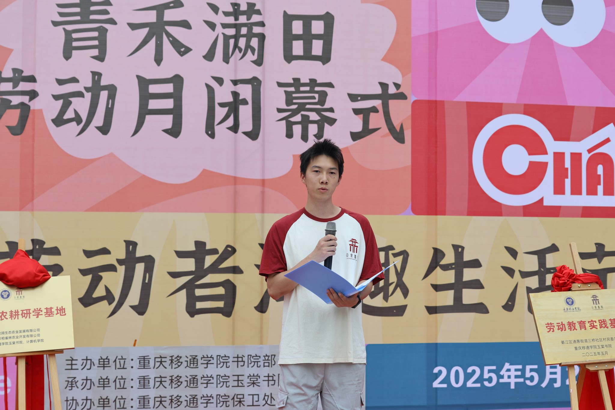 5月23日下午,重庆移通学院第三届青禾满田劳动月闭幕式在明善图书馆前广场举行。本次活动由重庆移通学院书院部主办、玉棠书院承办,以“劳动者潮趣生活节”为核心载体,通过揭牌仪式、成果展演与沉浸式体验活动,全面展现重庆移通学院綦江校区三年来深耕劳动教育的实践成果。綦江区三桥村村民居委会副主任周呈刚,重庆市柏雀林农业有限公司负责人杜强、重庆移通学院副校长李文豹、书院部副部长曹玉姣、玉棠书院名誉院长苏锋等领导出席活动,与全校师生共同见证“劳动教育实践基地”与“农耕文化研学基地”双基地揭牌的重要时刻。