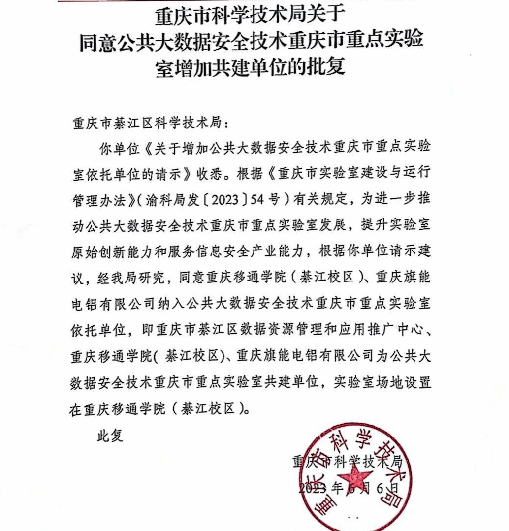 6月6日,我校綦江校区迎来喜讯!重庆市科学技术局下发的《重庆市科学技术局关于同意公共大数据安全技术重庆市重点实验室增加共建单位的批复》文件中,同意我校綦江校区、重庆旗能电铝有限公司纳入公共大数据安全技术重庆市重点实验室依托单位,即重庆市綦江区数据资源管理和应用推广中心、重庆移通学院(綦江校区)、重庆旗能电铝有限公司为公共大数据安全技术重庆市重点实验室共建单位,实验室场地设置在我校綦江校区。我校公共大数据安全技术重庆市重点实验室成为全国首家政校企共建省部级重点实验室!