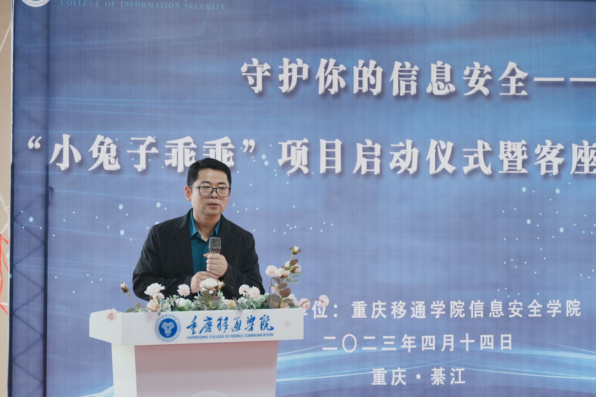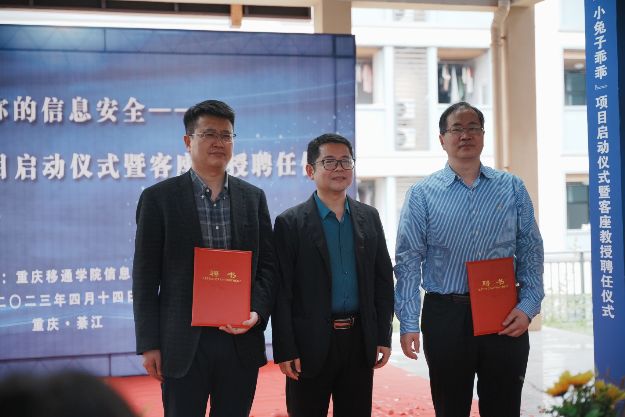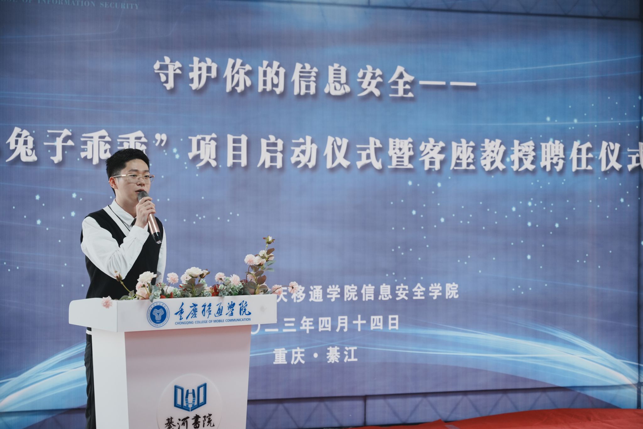 4月14日下午,由重庆移通学院主办、信息安全学院承办的守护你的信息安全——“小兔子乖乖”项目启动仪式暨客座教授聘任仪式在我校綦江校区綦河书院2号楼几何空间成功举行。綦江区人大常委会主任母明江、綦江区人大常委会副主任褚洪春、綦江区大数据应用发展管理局副局长黄洁、新加坡南洋理工大学教授黄广斌、北京邮电大学教授辛阳、重庆移通学院常务副校长王永周、学生工作处副处长梁少锋、信息安全学院副院长王宁以及学院师生代表们出席本次启动仪式。仪式由信息安全学院辅导员温朝一主持。