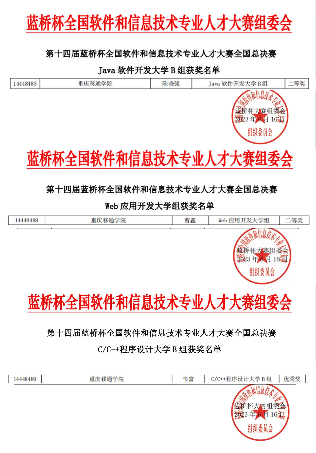 2023年6月10日,由工业和信息化部人才交流中心作为主办单位,国信蓝桥教育科技股份有限公司承办组织的第十四届蓝桥杯全国软件和信息技术专业人才大赛个人赛国赛重庆分赛点在重庆邮电大学举办。来自全国1064所高校、14000余名顶尖选手同台竞技争夺全国总决赛。我校綦江校区网信中心崔向灵、秦连键老师指导的软件开发团队、一石技术工坊陈晓强、韦富、曹鑫三名同学作为重庆市赛一等奖选手,代表我校参加了软件类Java B组、C/C++ B组、Web应用开发组决赛,并取得2枚全国二等奖、1枚全国优秀奖的好成绩。