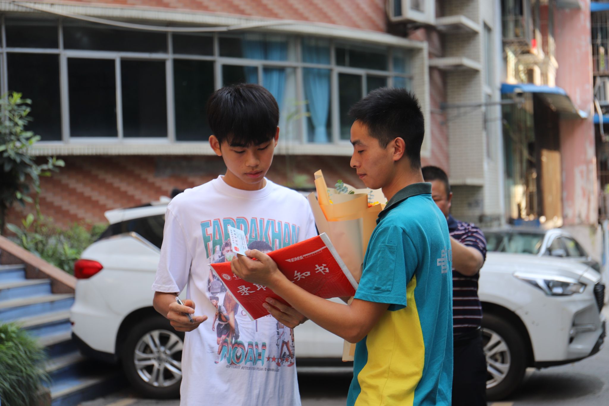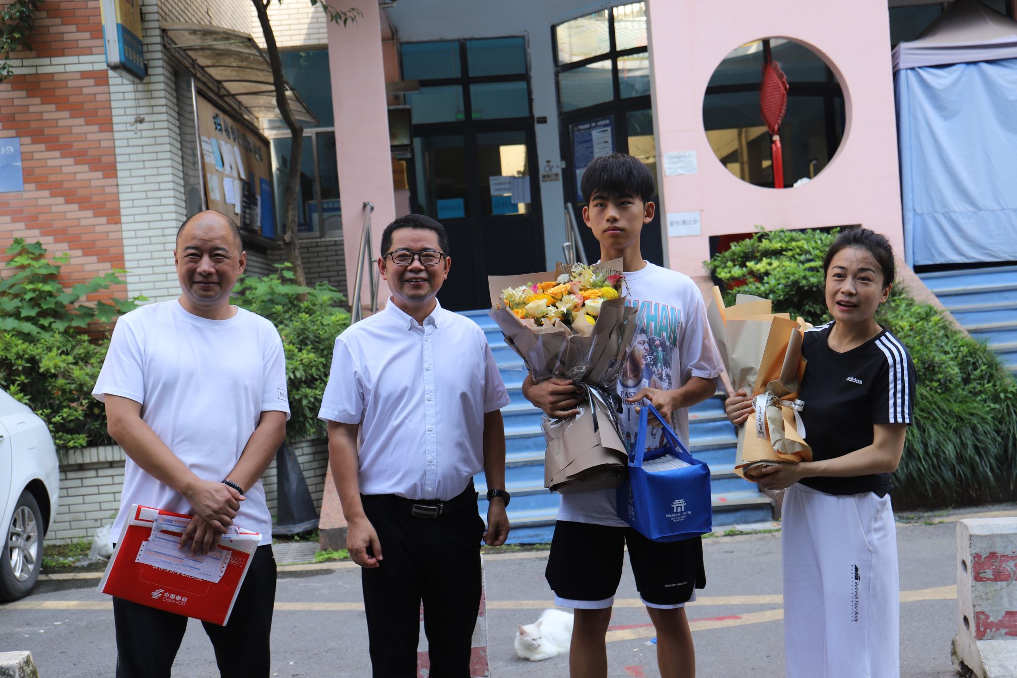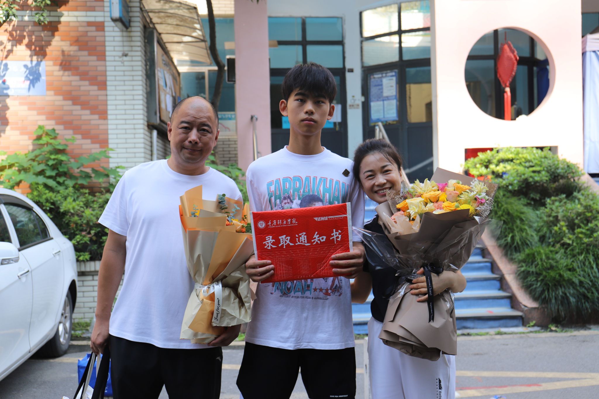 今日上午10点,我校党委书记何先刚,常务副校长王永周,戏剧影视学院院长王芳,党委组织宣传部部长苏述庚,招生处处长张成川等一行人来到重庆市南岸区,将学校今年秋季高考的第一封本科(艺术)录取通知书送到了杨若愚同学手中。
