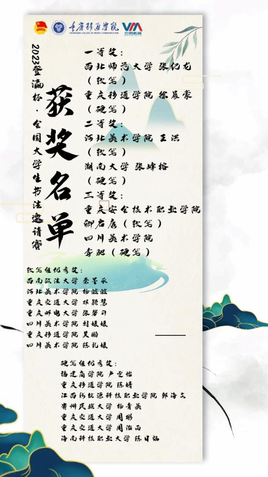 2个专业类别(硬笔、软笔)、7个外围活动、1场名家交流会,当日1300余人次共同见证传统文化的妙笔生花。11月17日,由重庆移通学院主办、共青团重庆移通学院委员会承办,重庆市硬笔书法家协会指导的2023登瀛杯·全国大学生书法邀请赛在我校綦江校区完美收官。