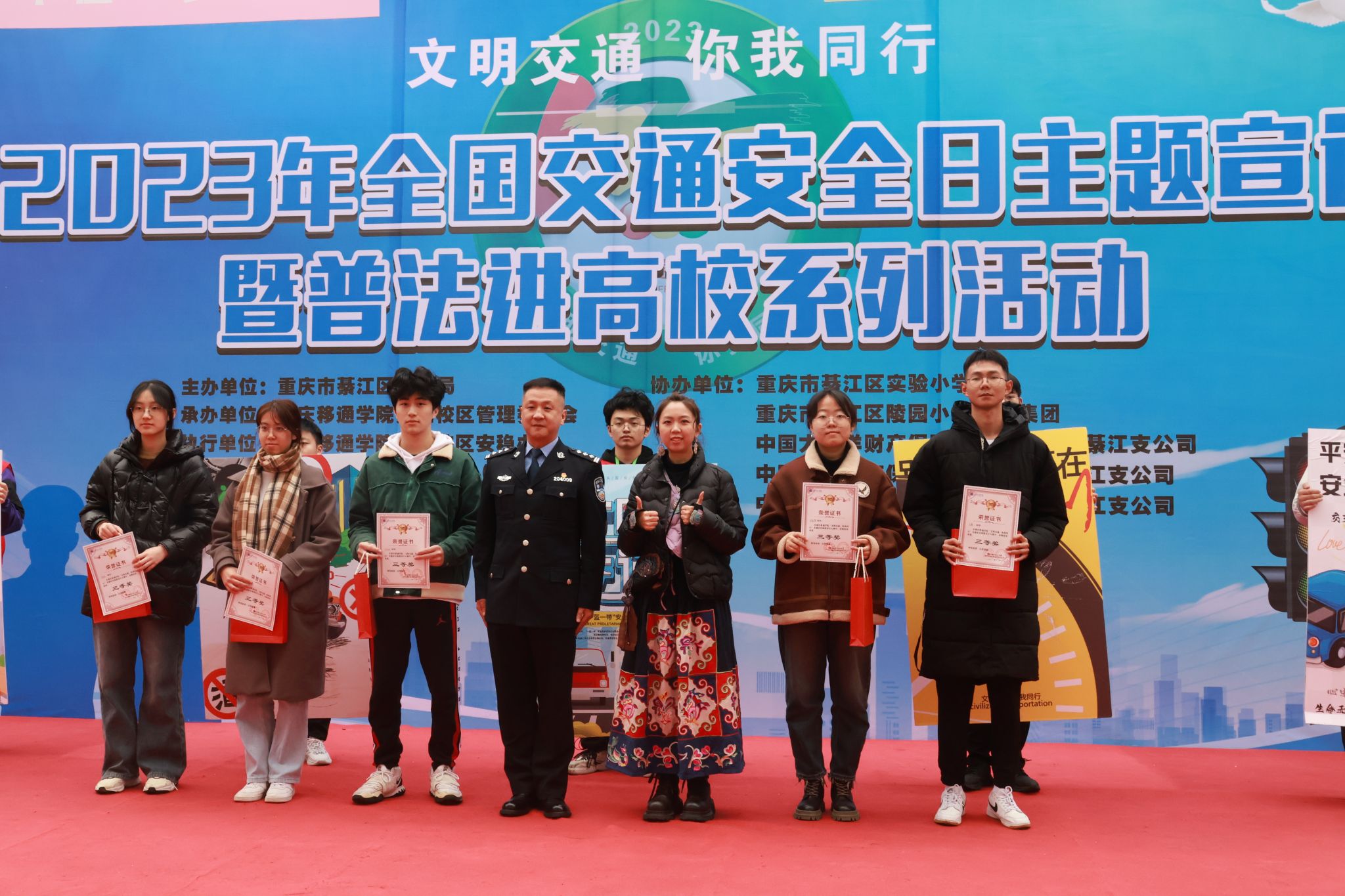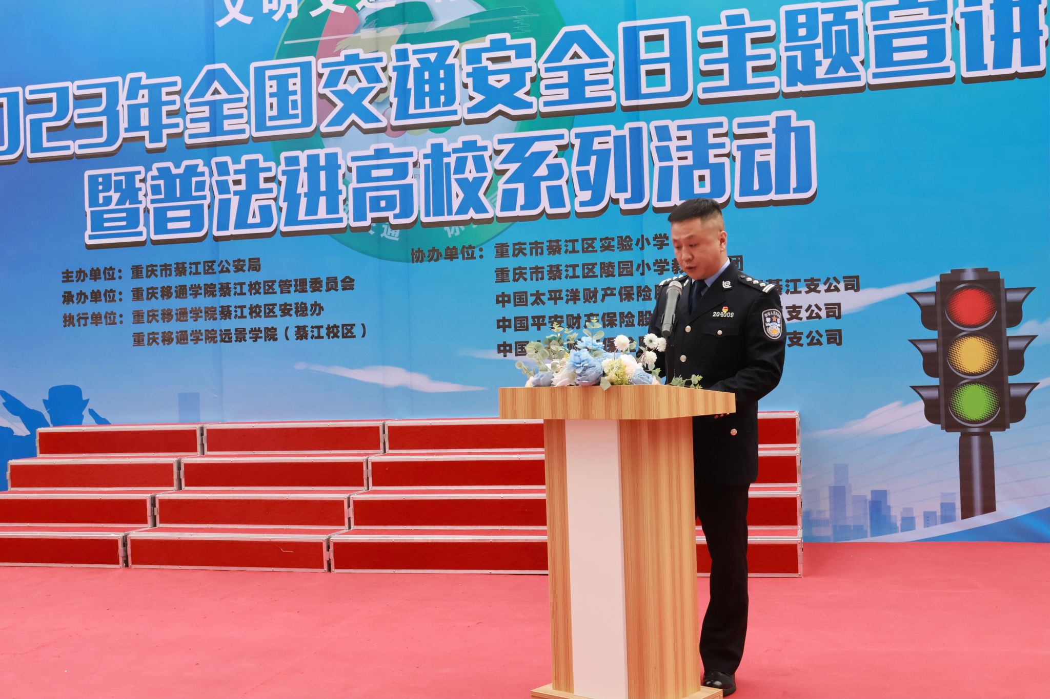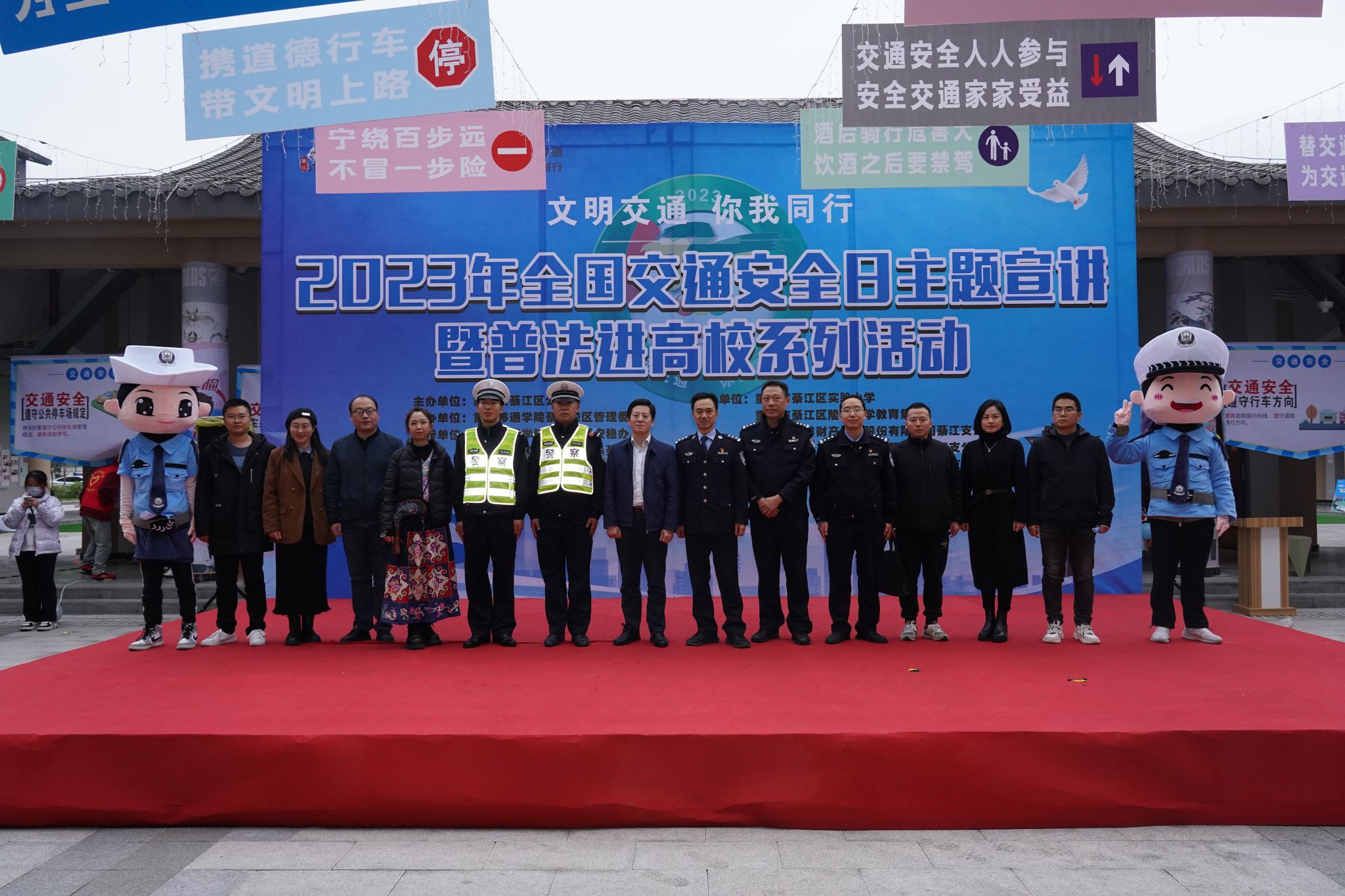 在第十二个“全国交通安全日”到来之际,为加强道路交通安全教育,提高道路交通安全意识,引导学生养成遵守交通规则、文明出行的良好习惯,积极营造全社会共同关注交通安全的浓厚氛围。12月1日,重庆移通学院(綦江校区)安稳办、远景学院联合重庆市綦江区公安局交巡警支队开展“文明交通·你我同行”2023年全国交通安全日主题宣讲暨普法进高校系列活动在古剑书院中庭如期开展,区交通局、团区委、区教委、区委网信办、各中小学等61家单位及企业代表应邀到场。