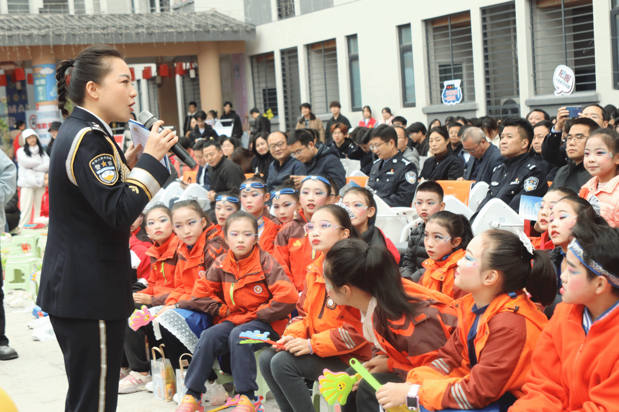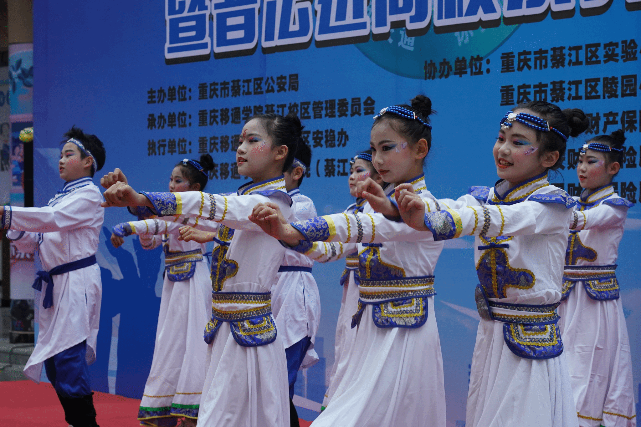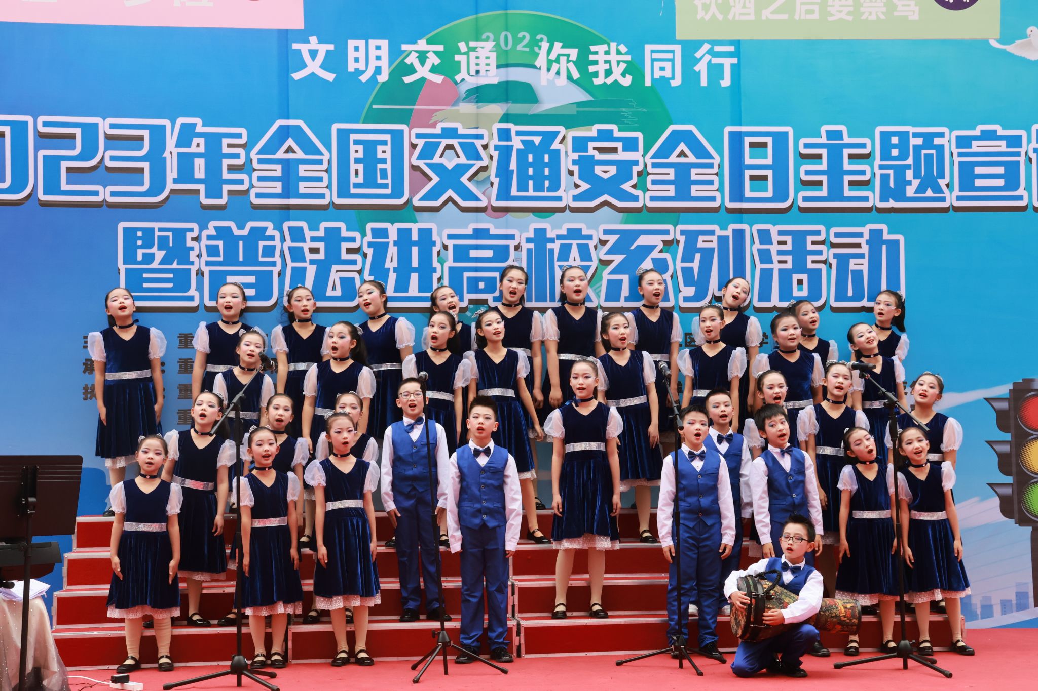 活动正式开始,由远景学院学生原创编排的交通安全短剧《交通安全无小事》率先登场,同学们用诙谐的语言和表演方式向大家传达了交通安全的重要性,并告诫大家无论何时切记不可存有侥幸心理。紧接着,区实验小学学生带来合唱《把未来点亮》《米多多之歌》及歌舞表演《茫茫敕勒川》;区陵园小学学生带来歌舞表演《红领巾心向党》,孩子们童真而动人的歌声给在场师生带来温暖和感动;远景学院学生自制短视频《是谁杀了他》在现场展播,视频通过回溯交通事故发生的起因,郑重告诫大家道路千万条,平安第一条;区公安局民警杜森林演唱歌曲《万疆》《不忘初心》,他以沉厚的歌声和深情的表达,传递出对祖国最真切的祝愿;区实验小学老师杨晓筱带来青春活力的独唱《第一天》《我以渺小爱你》;区公安局交巡警支队以交通手势操表演展现交巡警风采,也让大家对交通手势加深了记忆和了解。