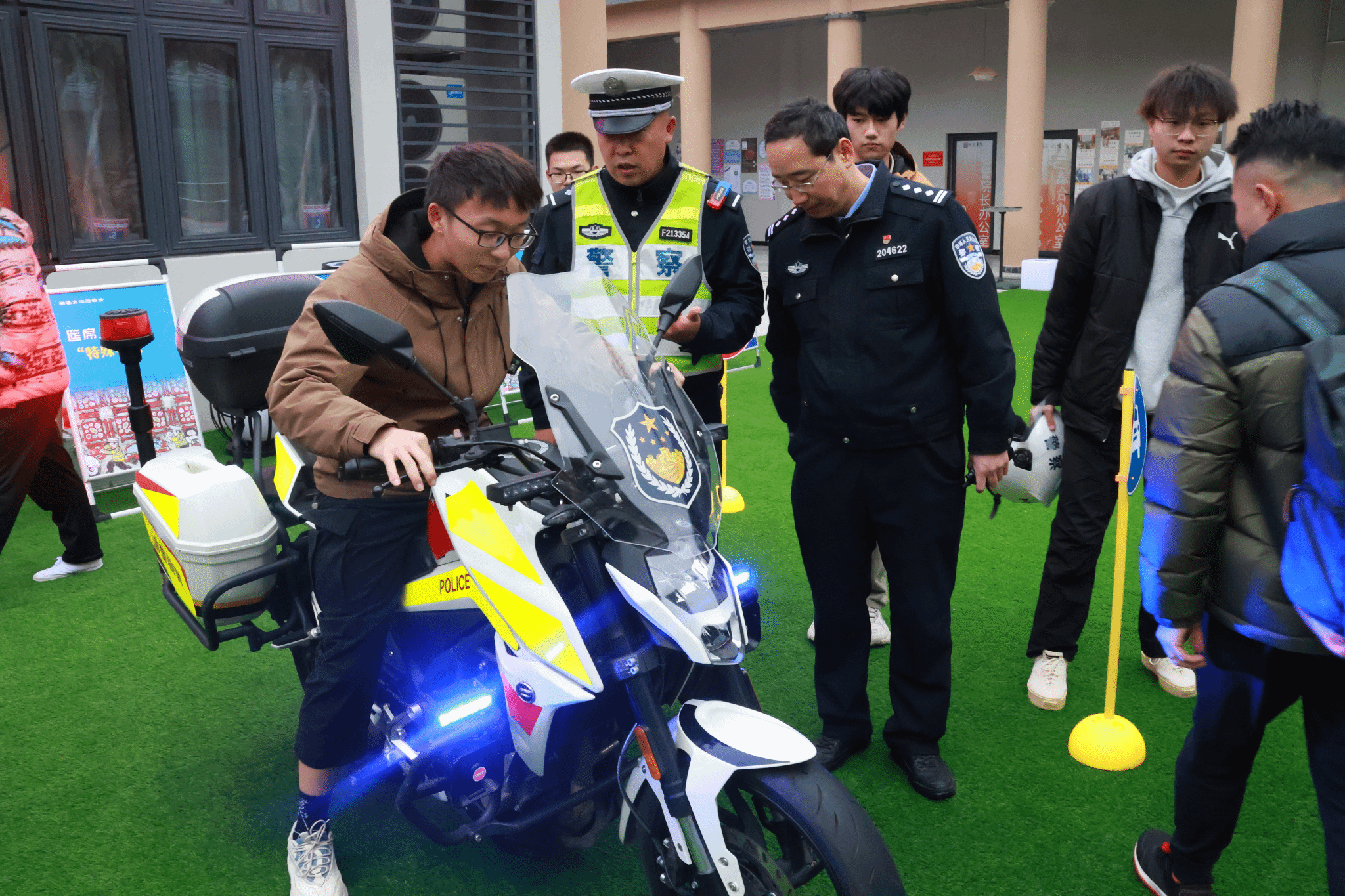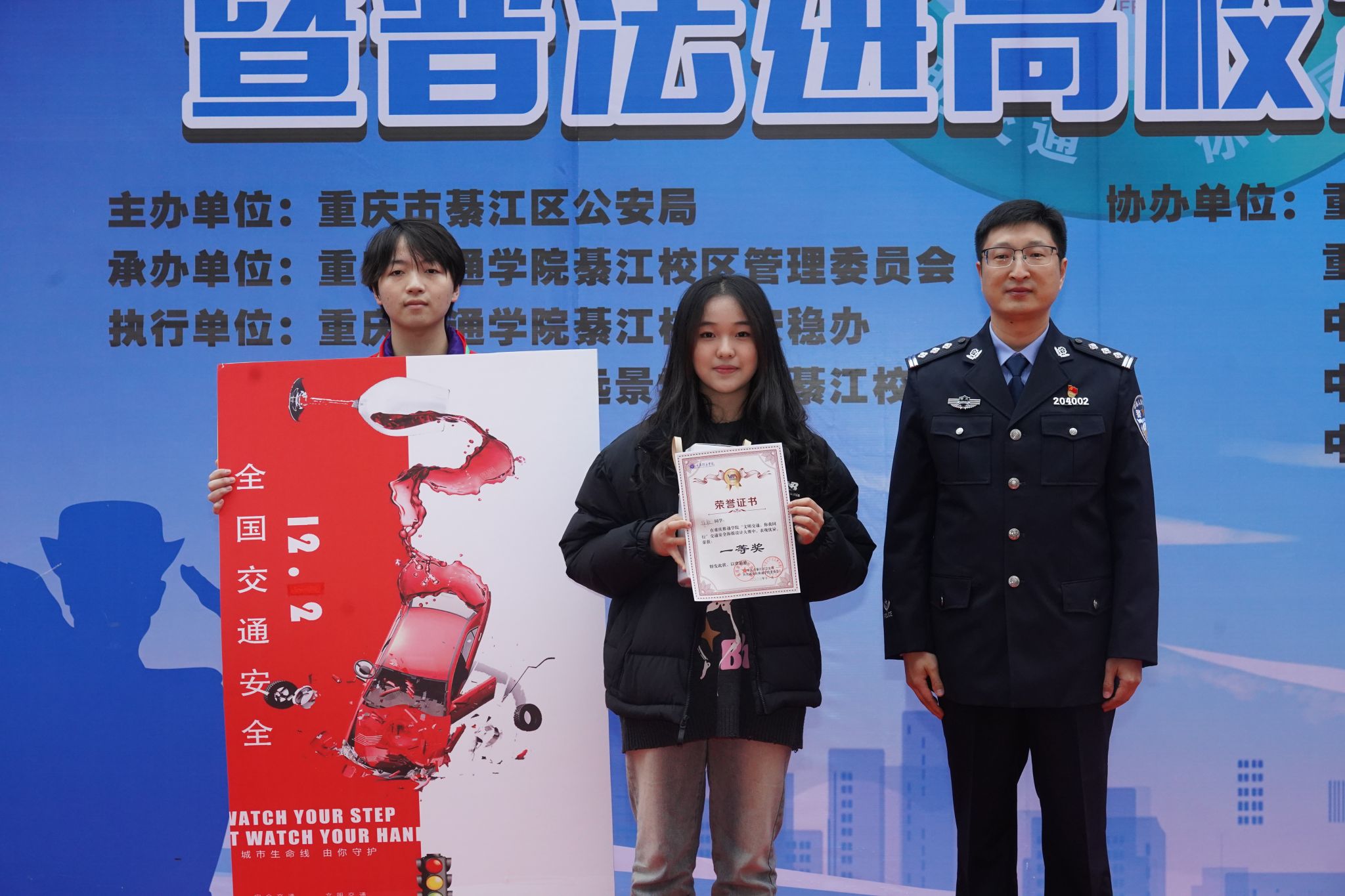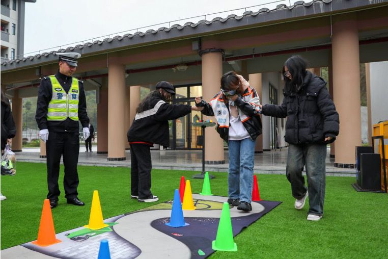 表演结束后,区公安局交巡警支队民警曹莹作“12·2国家交通安全日主题宣讲”,曹警官通过互动问答的方式让大家了解到更多的交通安全知识,“今年是第十几个交通安全日,主题是什么?”“驾驶电动摩托车需要考取驾驶证吗?”““一盔一带”是什么?”随着问题提出,现场师生积极举手抢答,在互动过程中,交通安全知识也在师生心中留下深刻烙印。“人在旅途,平安是福。关爱生命,文明出行”,交通安全意识不应只跃于纸笔之间,所以活动现场还设置有模拟酒驾、渝警骁骑、交通标志学习、案例警示体验区。同学们都争先恐后地进行各项体验,戴上模拟醉酒眼镜穿越路障、骑上骁骑向交巡警队员了解如何操控等。通过这些体验项目,同学们学习了解到更多的交通安全知识,例如驾驶摩托车应有牌证、戴头盔、限两人、靠右行,醉酒驾驶机动车已纳入刑法等,同学们也纷纷表示交通安全与我们每一个人都息息相关,其重要性不可小觑,我们应从自身出发,做好带头作用,并将相关知识传播给更多身边的人。