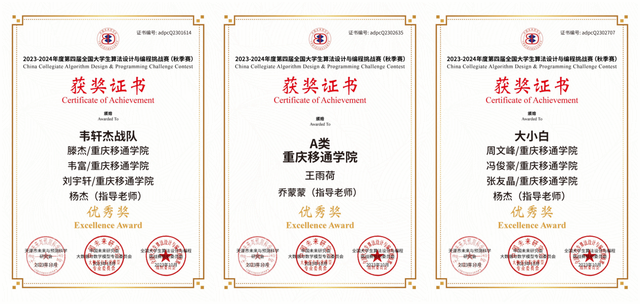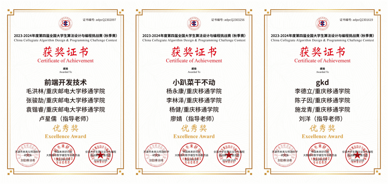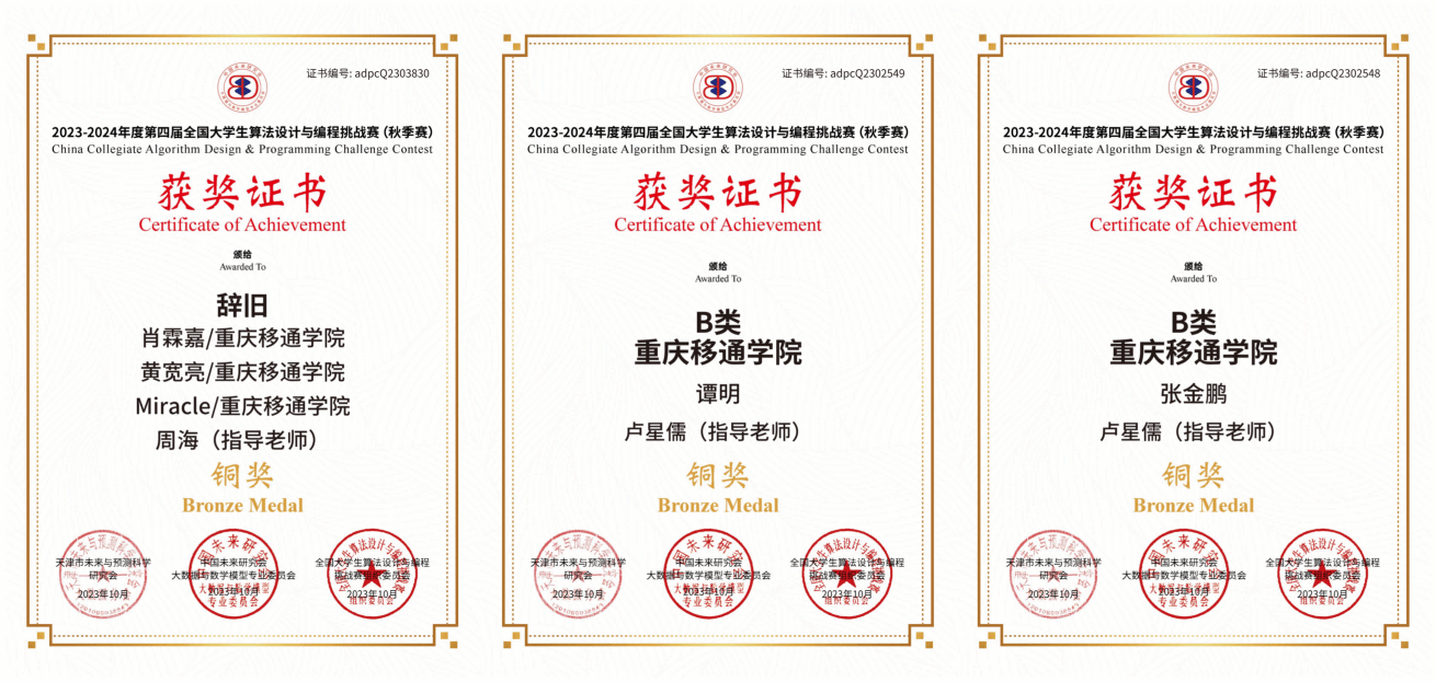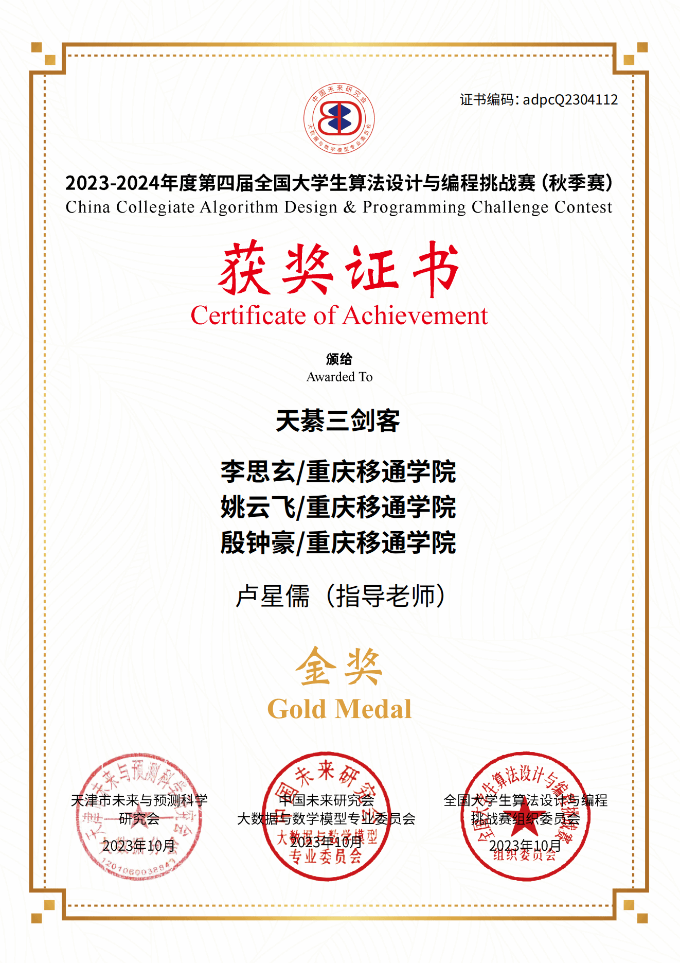 12月26日,第四届全国大学生算法设计与编程挑战赛已落下帷幕,比赛吸引了近千所高校3000多支队伍近7000人报名参赛,参赛队伍不乏北京大学、清华大学、中国人民大学、复旦大学、厦门大学等著名高校。计算机学院创新中心学子李思玄、姚云飞、殷钟豪组成的参赛队伍一举斩获全国金奖1项,卢星儒老师被评为优秀指导教师;肖霖嘉、谭明、张金鹏所代表队伍分别获得全国铜奖3项;杨永康、周文峰、王雨荷、毛洪林、李德立、滕杰所代表队伍分别获得全国优秀奖6项,共10项获奖的好成绩。