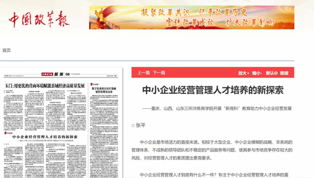今年,学校的商科教育取得了新突破。4月,移通淬炼商学院教师原创的教学案例《合优网:一个区县互联网企业的数字营销服务》被清华大学经济管理学院中国工商管理案例中心收录,用于各商学院课堂教学。9月,《中国改革报》登载重庆、山西、山东三校淬炼•国际商学院“新商科”模式,解读了中小企业经营管理人才的新探索。11月,中国中小企业协会常务副会长马彬为移通授予“中国中小企业协会常务理事单位”。同月,中国新商科大学集团商科教育板块与清华大学中国工商管理案例研究中心达成合作共识,共同推进信息产业商业案例研究中心建设。同时,移通成功举办2023重庆市首届区县互联网企业发展论坛,学校和商科教育影响力触及重庆所有区县及乡镇。