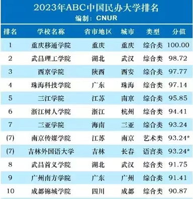 2023年,学校借助品牌领先优势,立足学校 “信息产业商学院”办学定位,紧紧围绕“中国民办大学第一”“中国大学素质教育排头兵”两大主题口号开展主题系列宣传,加速宣传效应,突出品牌故事,传播品牌声音。4月,由ABC咨询机构编制的2023年ABC中国民办大学排名权威发布,移通以总分第一位居榜首,这是继2022年登顶以来再次蝉联第一。8月,移通在顶端教学质量评估(重庆)有限公司发布的重庆民办本科院校满意度排行榜中位居第一。11月,移通凭借极强的综合实力与影响力荣获“2023年度中国综合实力民办高校”称号。