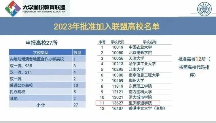 4月,移通正式成为大学通识教育联盟理事单位,是联盟中仅有的两所民办大学之一。移通本次加入大学通识教育联盟,充分印证了学校独具特色的通识教育模式经过多年探索,逐渐得到了全国同行和专家广泛关注和认可,为学校通识教育发展提供了新起点、新平台。5月,由重庆移通学院、合川区社科联主办的“重庆市社科界第八届学术年活动暨应用型大学通识教育研讨会”在移通圆满举行,此次研讨会以通识教育为纽带,联动地方、企业、高校,以多维视角共商应用型大学育人使命和路径。10月,中国高等教育学会大学素质教育研究分会2023年会暨第十一届大学素质教育高层论坛在温州医科大学盛大开幕。该论坛汇集来自全国各地140多所高校1700多位嘉宾代表共同参会。我校成功加入中国高教学会素质教育分会,并当选常务理事单位。