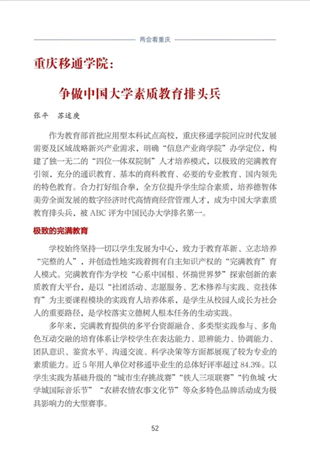 与此同时,本年度《半月谈》“两会看重庆”专刊以《重庆移通学院:力争做中国大学素质教育排头兵》为题报道我校素质教育成果;重庆市教委秘书组以《重庆移通学院打造“社区书院”构建高校素质教育创新载体》发布我校书院制建设;中国改革报以《中小企业经营管理人才培养的新探索》为题报道我校新商科教育新思考;重庆青年报以《三百余所高校参与 现场大咖云集钓鱼城·全国大学生影评大赛在渝成功举办》为题报道我校品牌活动;《半月谈》以《专业在学院,生活在书院》为题报道我校书院建设成果;中国县域经济报以《政校企共建省部级重点实验室》为题报道学校专业教育建设;新华网《新华每日电讯》以《重庆綦江:老工业区如何迸发新活力》为题,中英双语报道中将学校綦江校区建设成果评价为綦江区建设发展的有力支撑;《光明日报》以《重庆移通学院:当科幻走进课堂》为题报道我校特色教育建设。12月,由我校艺术教育中心教师Wya乌鸦 (吴程臣)参与创作的《C大调》登上央视舞台,艺术教育中心教师周序彬带领我校大学生舞剧团学生参与《C大调》视频拍摄。除此之外,学校各方面建设成果获得各大官方主流媒体认可及报道1600余篇,品牌成果铿锵有力。