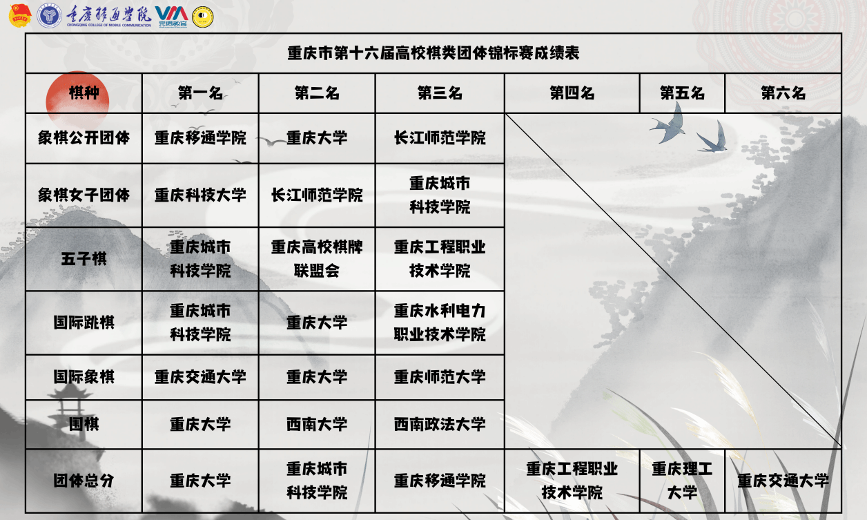 胜固欣然,败亦可喜。经过激烈的角逐,最终重庆大学摘的团体总分桂冠。重庆城市科技学院和重庆移通学院分别获得团体第二名和团体第三名的荣誉。
