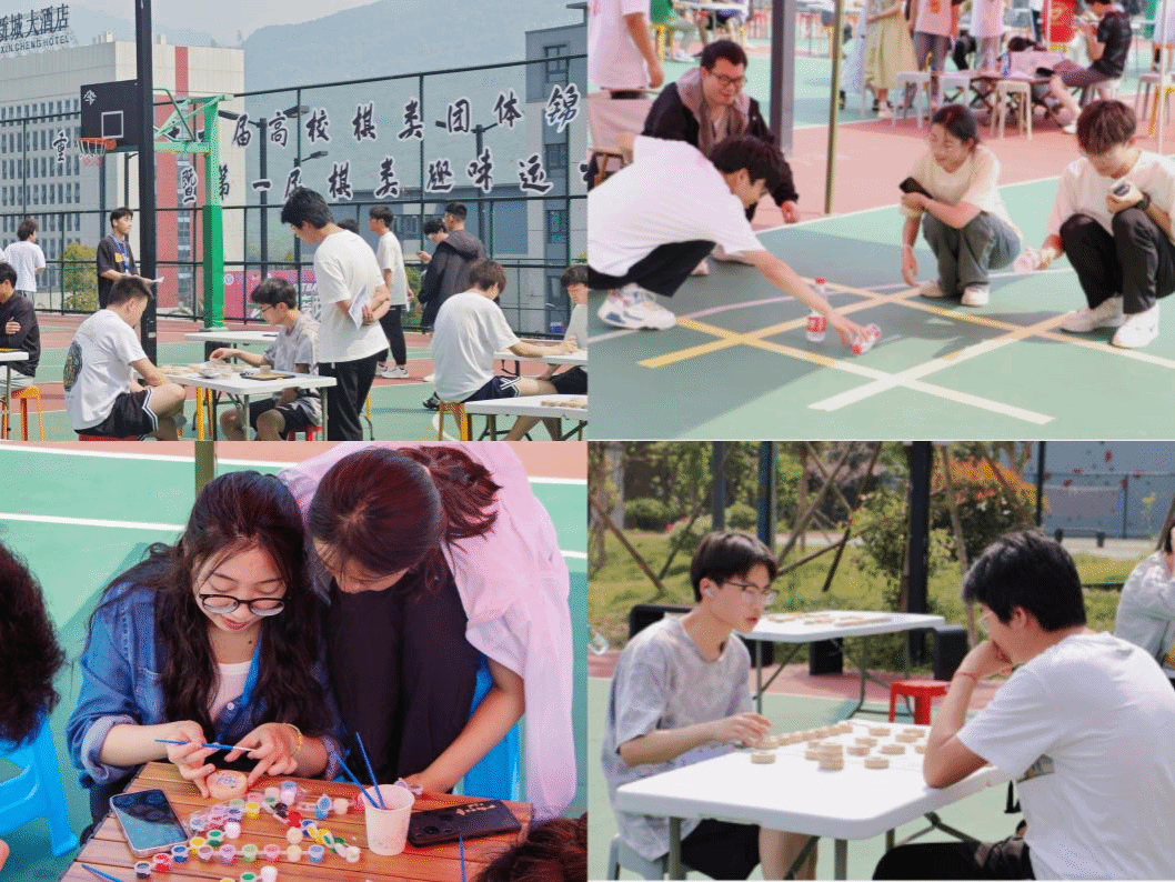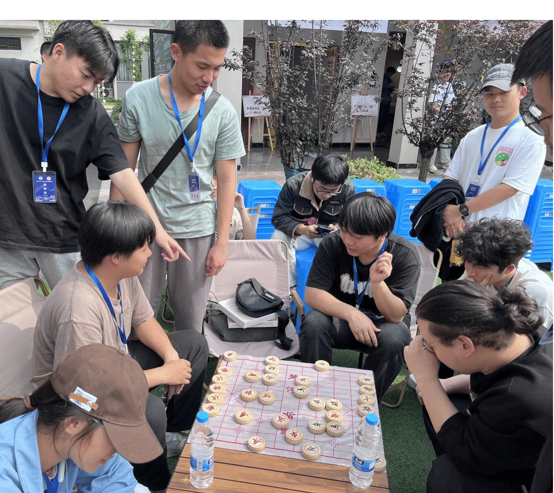 除现场赛事交锋外,更有“书院+学院”双院联动带来的一系列特色外围互动体验活动,让市内各高校棋类爱好者在移通学院的体验感拉满!由瀛溪书院牵头开展“棋类趣味运动会”、以车轮战、擂台赛等形式,为在渝高校以及本校的棋类爱好者们提供交流经验、棋艺切磋的综合展示舞台;由计算机学院将“滴胶象棋”“英文五子棋”“棋类知识大比拼”“棋样拓印”“棋种普及课堂”多元化棋类文化的互动体验式摊位让人应接不暇;更有幸邀请到重庆市围棋协会、象棋协会、国际象棋协会资深棋手亲临酒会交流现场,与参赛选手进行一对一的深入交流,让棋类文化得到专业化、规范化、兴趣化的输出。